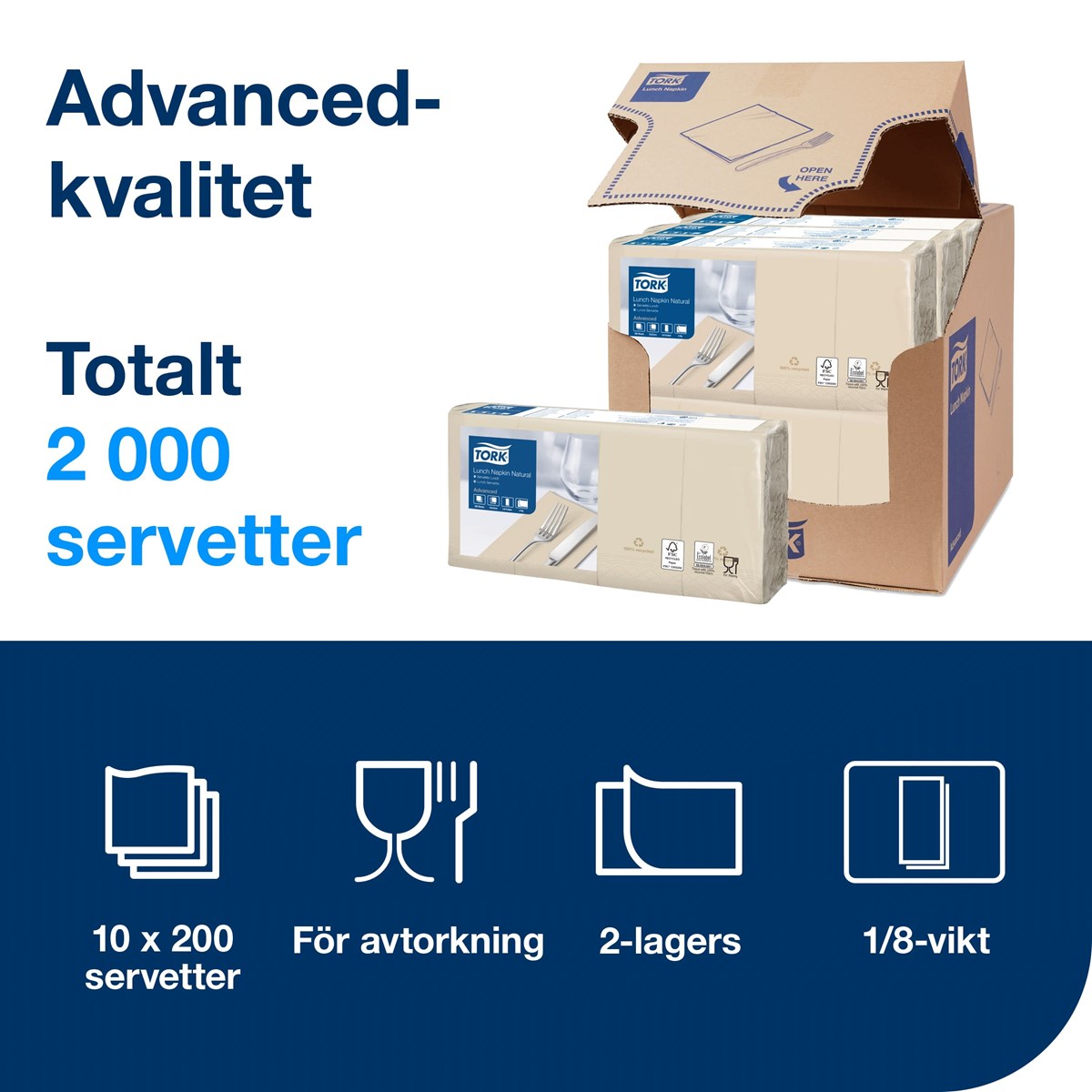 2-lags, naturligt brun servett i hög kvalitet (Advanced). Komposterbar (EN13432) och tillverkad av 100% återvunnet papper. Förtryckta med texten ”100% recycled”. 1/8 vikning.