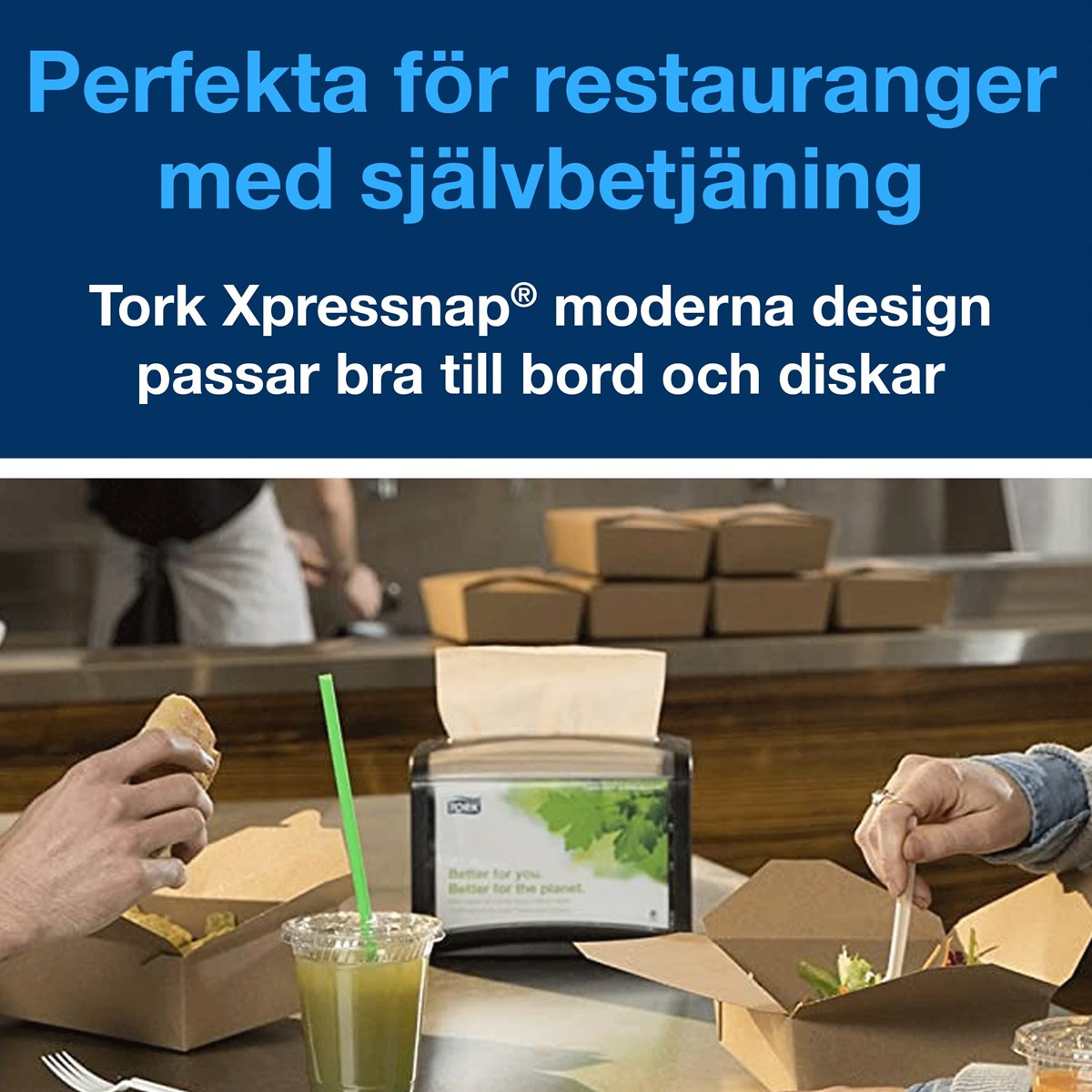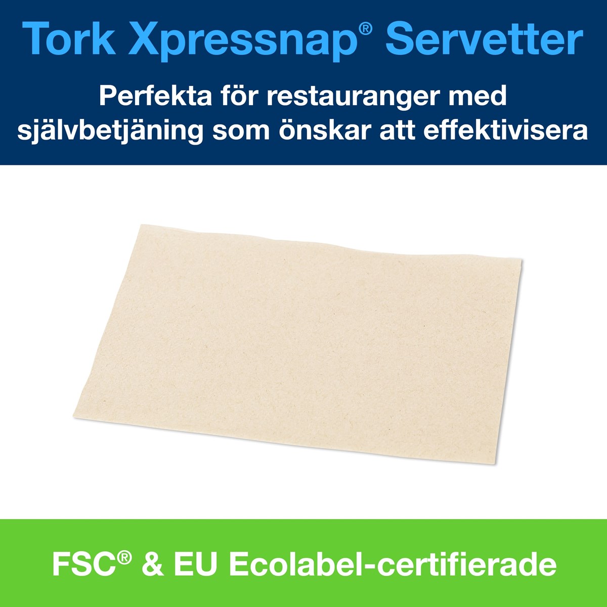 Tork Xpressnap Servettdispenser är ett utmärkt val för restauranger med självbetjäning. Med detta system kan du minska förbrukningen med minst 25% jämfört med traditionella servettdispensrar. Naturfärgade servetter av 100% återvunnet material. Biologiskt nedbrytbara och komposterbara. Servetterna ligger vikta så att nästa ark automatiskt dras fram och ligger kvar för nästa person. 1/4-vikta, 1-lags. Format: 21,3 x 33 cm. 1125 st/förp. 8 förp./kartong.
