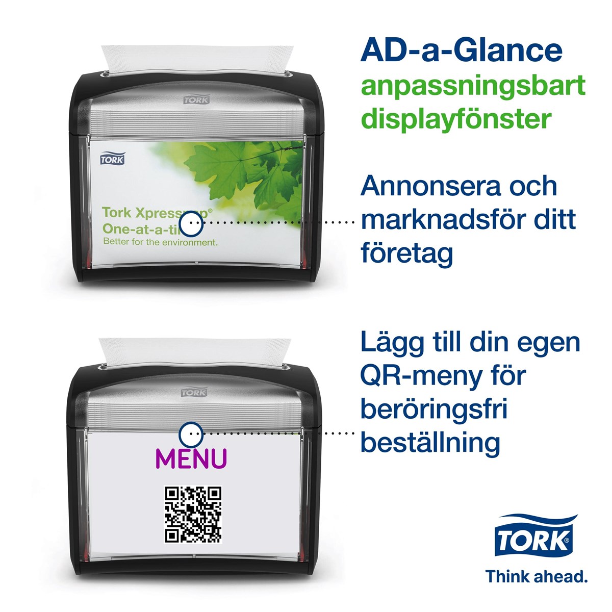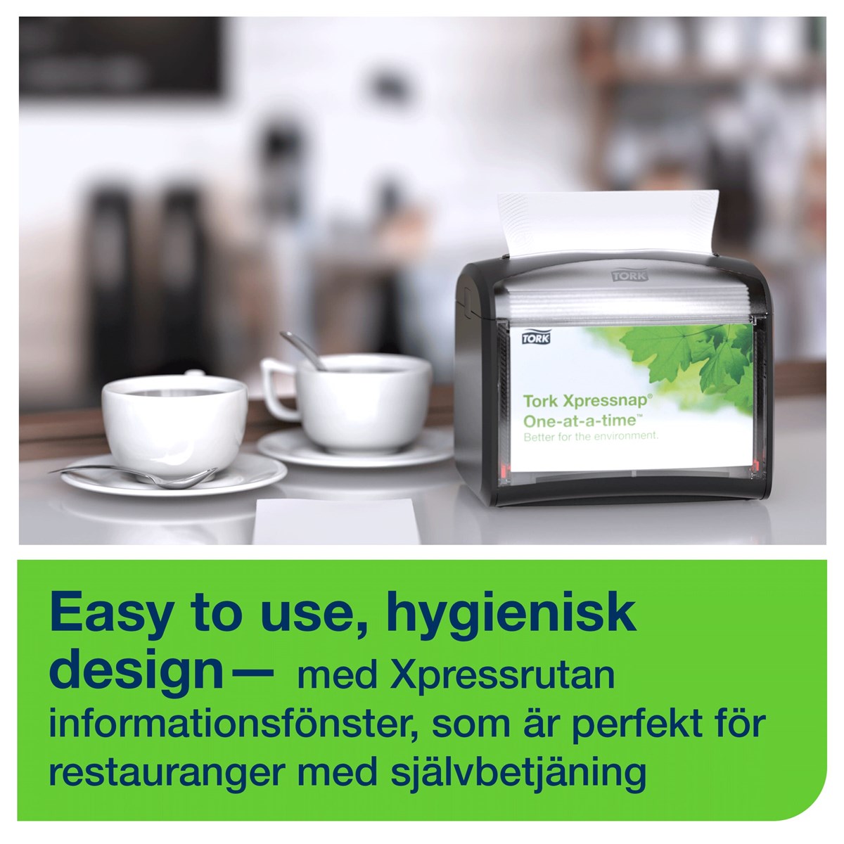 Kompakt och modern design Hållbara och lättskötta material för mindre underhåll Anpassningsbart informationsfönster för reklam eller instruktioner till personal Utmatning av ett ark i taget, förbättrar hygienen och minskar förbrukningen Brett urval av färger