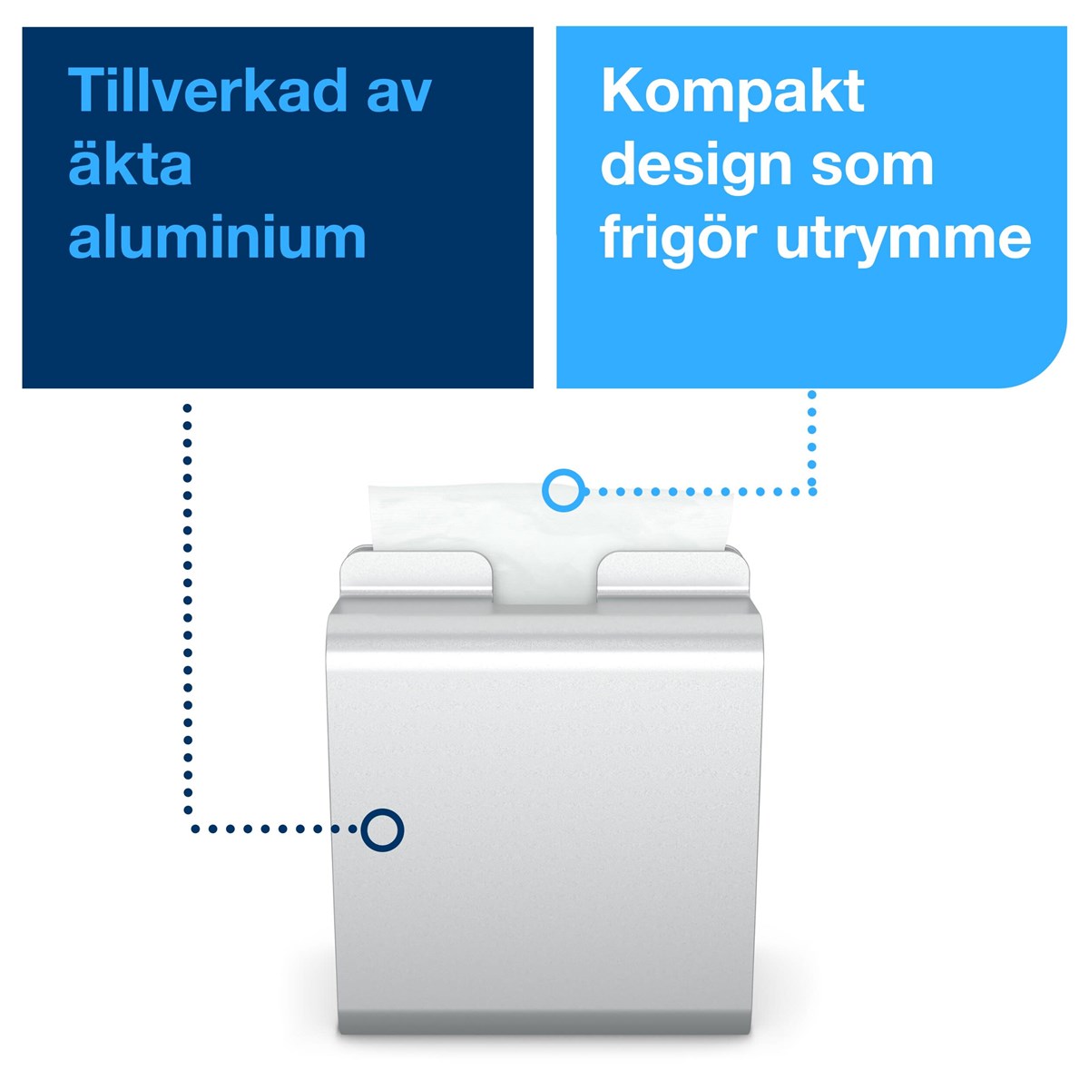 Elegant designad servetthållare i aluminium. Kompakt format som minimerar utrymmesbehovet på disken. Matar ut en servett i taget, vilket förbättrar hygienen och minskar förbrukningen med minst 25% jämfört med traditionella servettdispensrar. Mått: 20,9x17,8x15 cm. Rymmer 150 st N4-servetter.