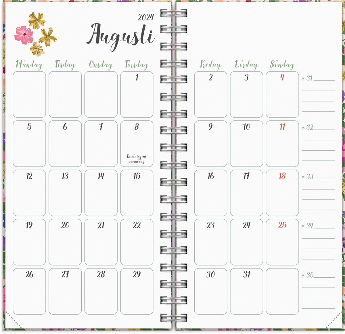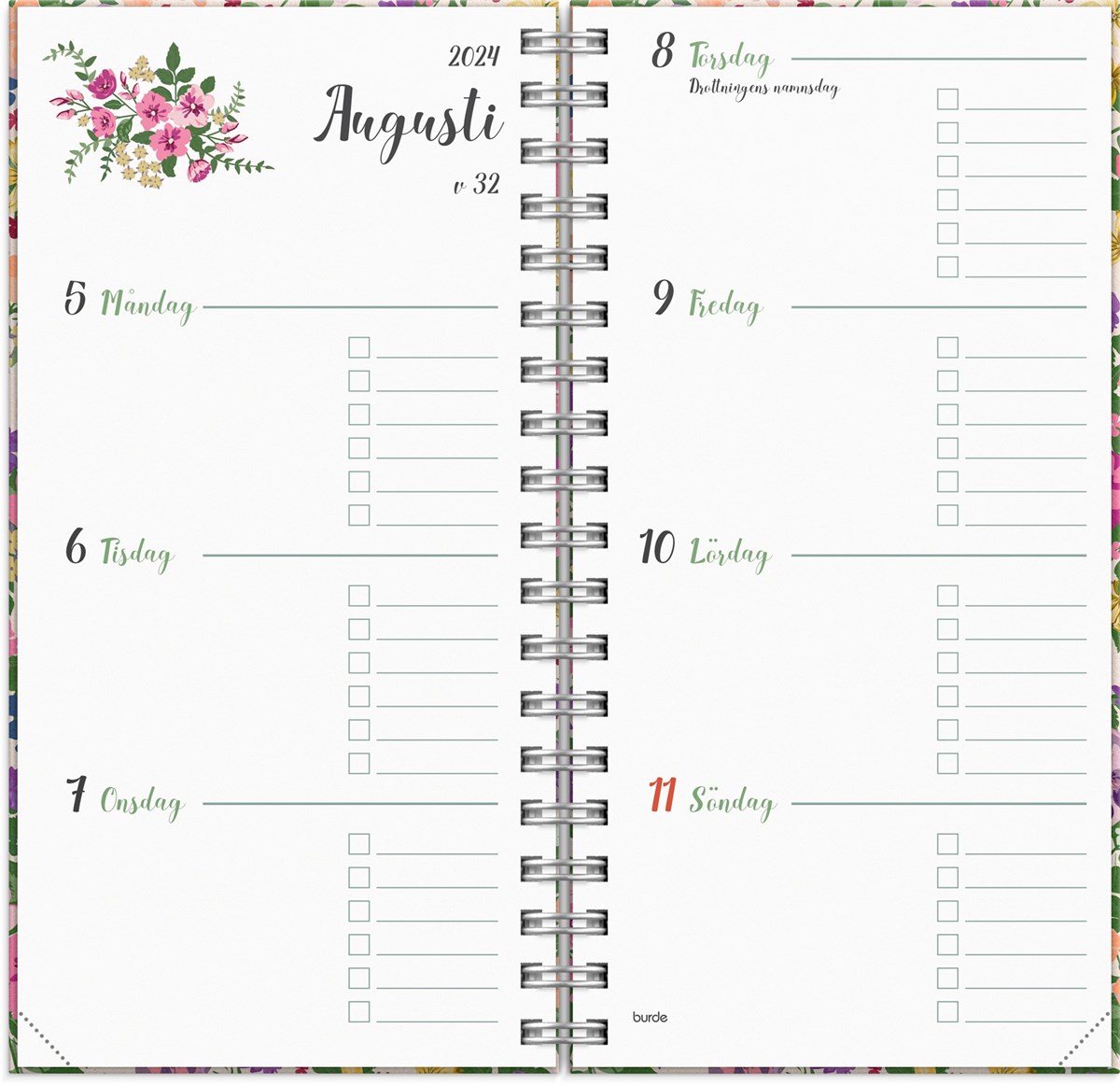 Kalender 2024 från Burde. Format: 83x158 mm. Layout: Liggande. Vecka/Uppslag. Kalendarium: 2023-12-25 - 2025-01-05. Omslag: Kartong med struktur. Spiralbunden. Innehåll: Årsöversikter. Antal sidor: 144. Miljöinformation: FSC.