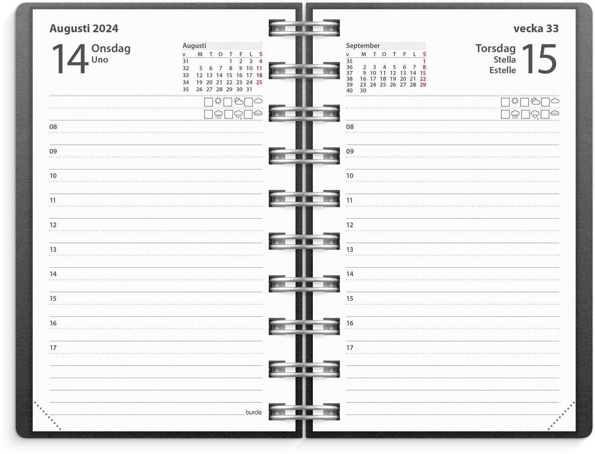 Kalender 2024 från Burde. Format: 79x127 mm. Layout: Dag/Sida. Timindelning 8-17. Kalendarium: 2024-01-01 - 2024-12-31. Omslag: Återvunnen kartong. Spiralbunden. Innehåll: Årsplaner. Antal sidor: 384. Miljöinformation: FSC. Omslag i återvunnen kartong. Tillverkad i Småland.