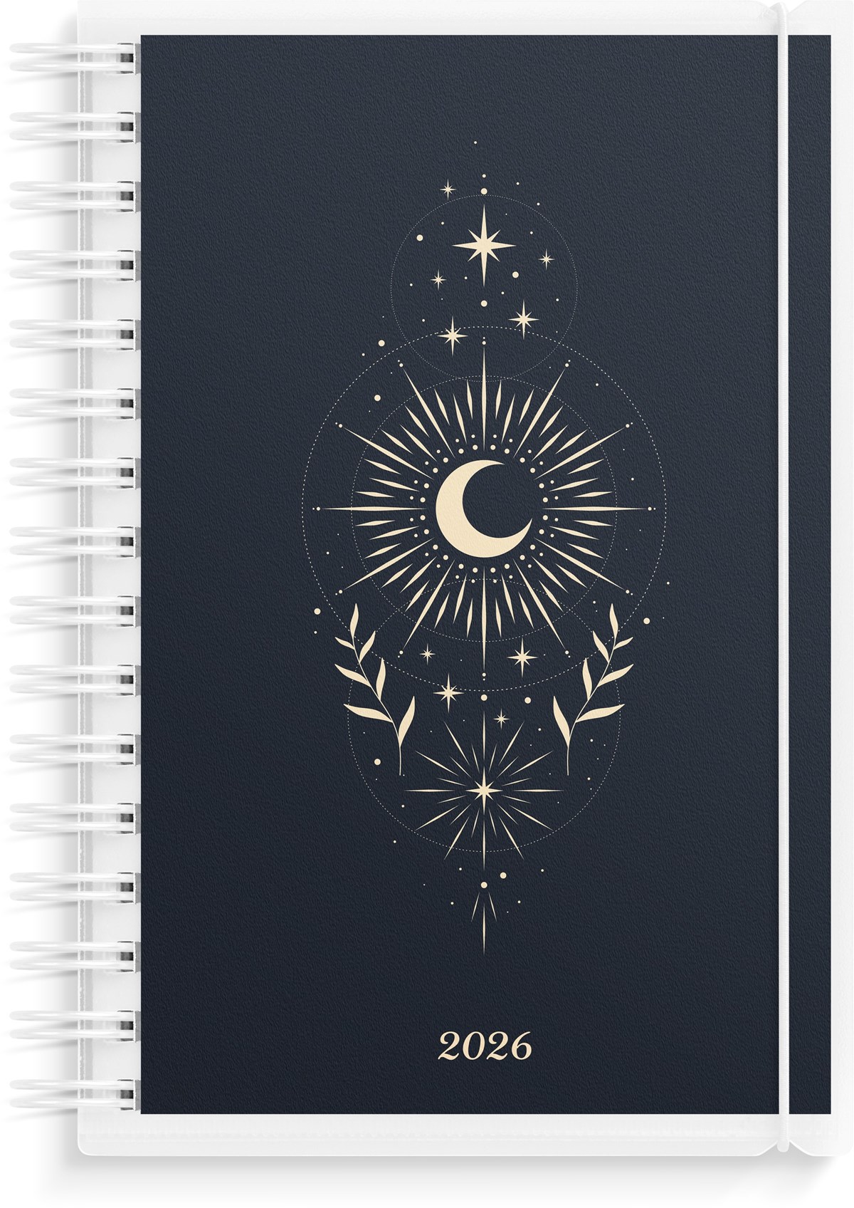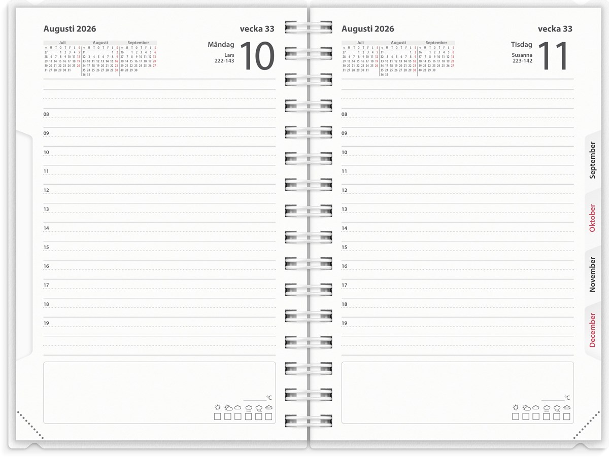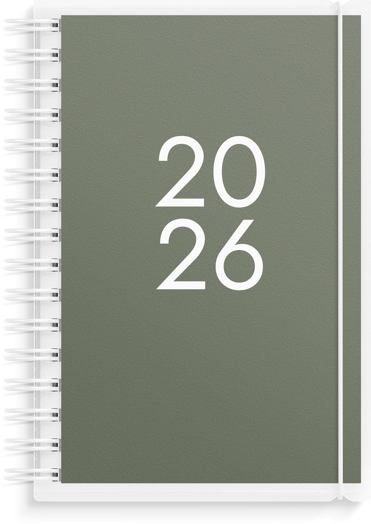 Format: 135x205 mm. Layout: Dag/sida. Timindelning 8-19. Kalendarium: 2026-01-01 - 2026-12-31. Omslag: PP-plast. Spiralbunden. Detaljer: Gummiband. Innehåll: Kyrkliga helgdagar, Flaggdagar, Helgdagar/aftnar, Månfaser, Namnsdagar, Internationella helgdagar översikt, Urstansat månadsregister, Temadagar/händelser, Årsöversikt/årsöversikter, Årsplan/årsplaner. Antal sidor: 400. Miljöinformation: FSC®.