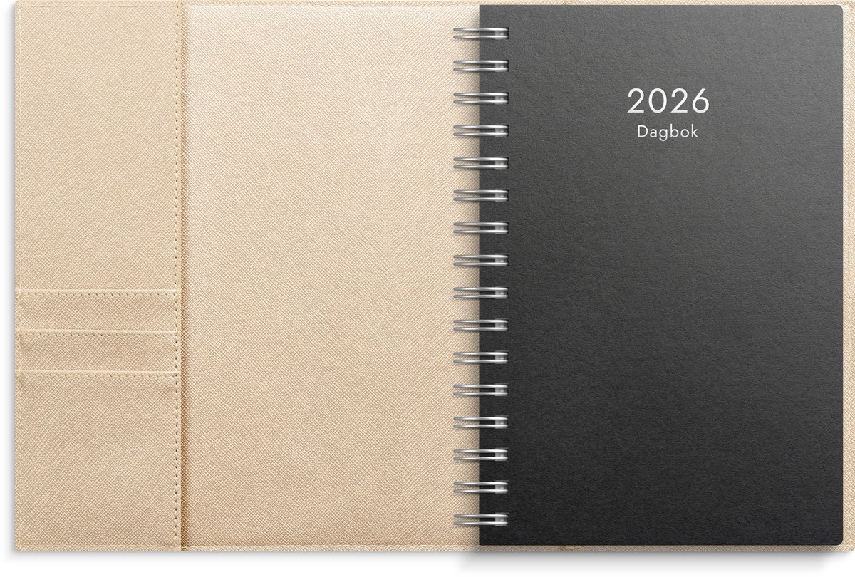 Format: 135x205 mm. Layout: Dag/sida. Timindelning 8-19. Kalendarium: 2026-01-01 - 2026-12-31. Omslag: Konstläder. Spiralbunden. Innehåll: Kyrkliga helgdagar, Flaggdagar, Helgdagar/aftnar, Månfaser, Namnsdagar, Internationella helgdagar översikt, Urstansat månadsregister, Temadagar/händelser, Årsöversikt/årsöversikter, Årsplan/årsplaner. Antal sidor: 400. Miljöinformation: FSC® papper.