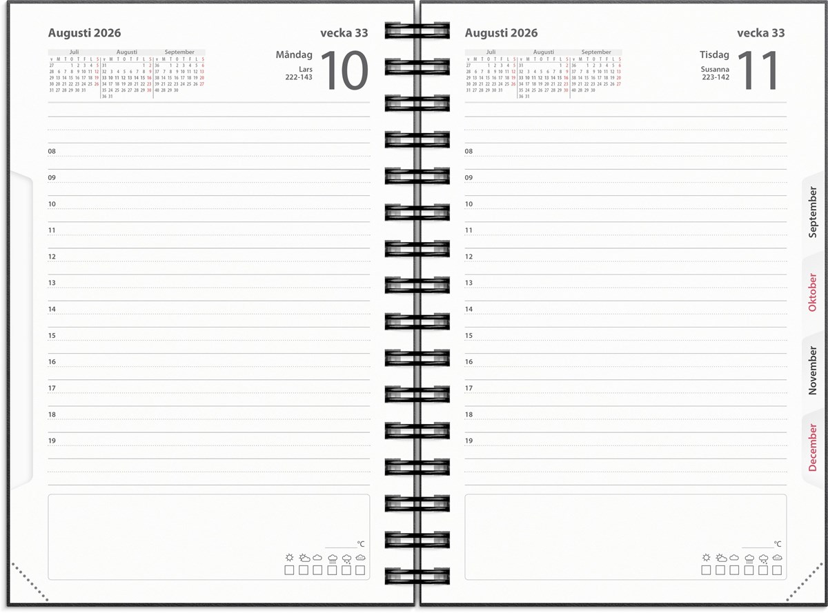 Format: 135x205 mm. Layout: Dag/sida. Timindelning 8-19. Kalendarium: 2026-01-01 - 2026-12-31. Omslag: Konstläder. Spiralbunden. Innehåll: Kyrkliga helgdagar, Flaggdagar, Helgdagar/aftnar, Månfaser, Namnsdagar, Internationella helgdagar översikt, Urstansat månadsregister, Temadagar/händelser, Årsöversikt/årsöversikter, Årsplan/årsplaner. Antal sidor: 400. Miljöinformation: FSC®.