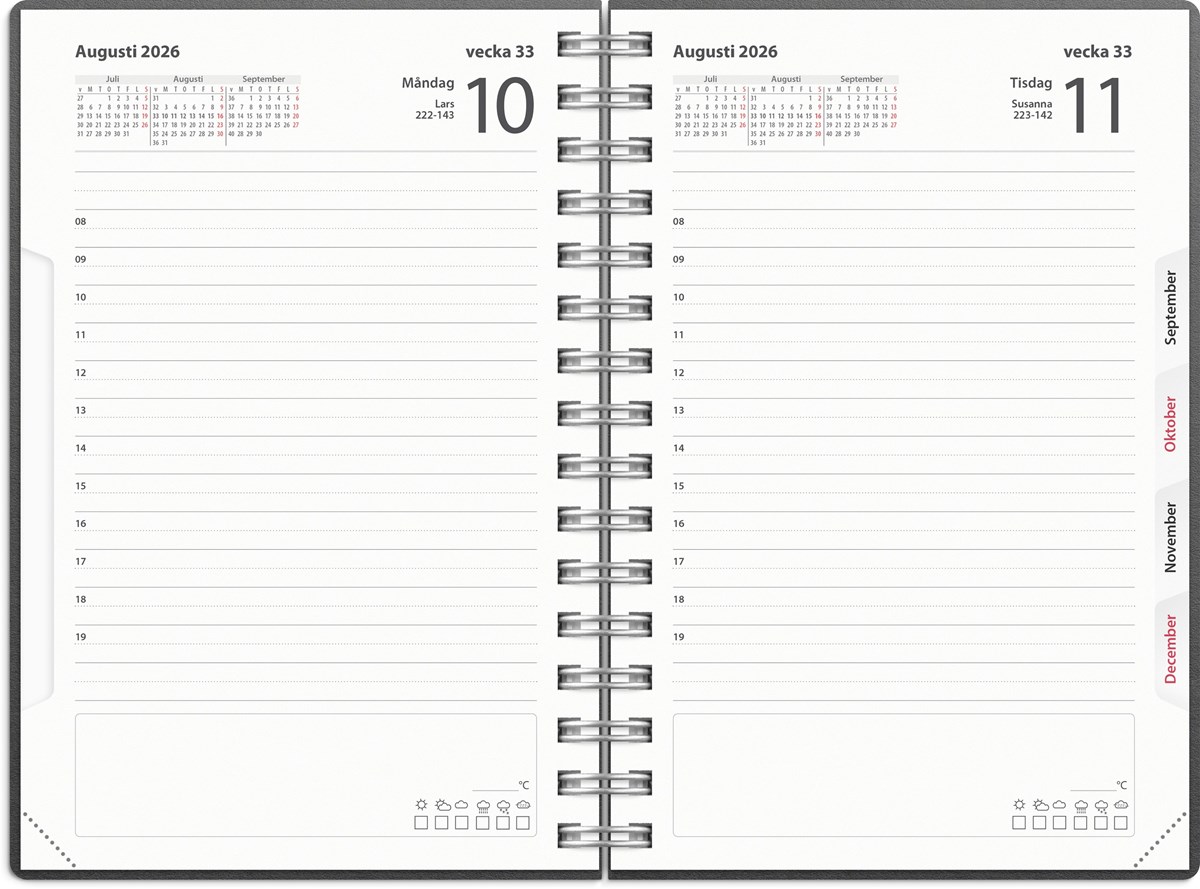 Format: 135x205 mm. Layout: Dag/sida. Timindelning 8-19. Kalendarium: 2026-01-01 - 2026-12-31. Omslag: Återvunnen kartong. Spiralbunden. Innehåll: Kyrkliga helgdagar, Flaggdagar, Helgdagar/aftnar, Månfaser, Namnsdagar, Internationella helgdagar översikt, Urstansat månadsregister, Temadagar/händelser, Årsöversikt/årsöversikter, Årsplan/årsplaner. Antal sidor: 400. Miljöinformation: FSC®. Omslag i återvunnen kartong. Tillverkad i Småland.