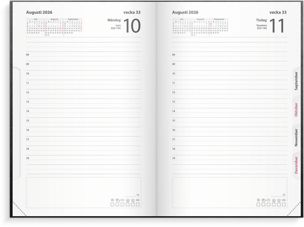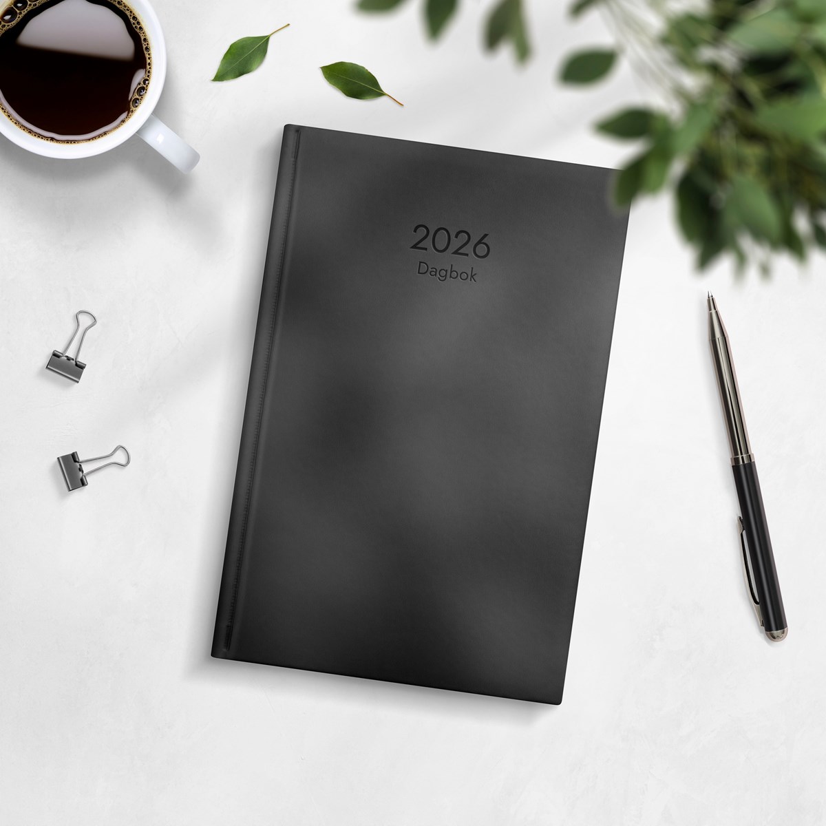 Format: 135x205 mm. Layout: Dag/sida. Timindelning 8-19. Kalendarium: 2026-01-01 - 2026-12-31. Omslag: Konstläder. Inbunden. Detaljer: Märkband. Innehåll: Kyrkliga helgdagar, Flaggdagar, Helgdagar/aftnar, Månfaser, Namnsdagar, Internationella helgdagar översikt, Urstansat månadsregister, Temadagar/händelser, Årsöversikt/årsöversikter, Årsplan/årsplaner. Antal sidor: 400. Miljöinformation: FSC® papper.