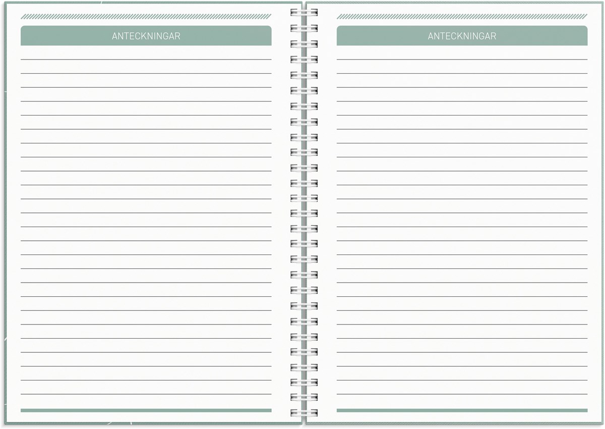 Format: A5. Layout: Liggande. Vecka/uppslag. Kalendarium: 2025-12-15 - 2027-01-03. Omslag: Kartong med struktur. Spiralbunden. Detaljer: Gummiband. Pappersficka. Innehåll: Flaggdagar, Helgdagar/aftnar, Månfaser, Namnsdagar, Internationella helgdagar översikt, Temadagar/händelser, Årsplan/årsplaner. Antal sidor: 144. Miljöinformation: FSC®.
