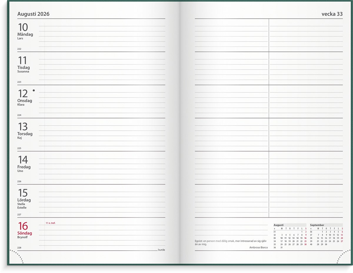Format: 150x230 mm. Layout: Liggande. Vecka/uppslag. Kalendarium: 2025-12-22 - 2027-01-03. Omslag: Kartong med struktur. Inbunden. Detaljer: Märkband. Innehåll: Kyrkliga helgdagar, Flaggdagar, Helgdagar/aftnar, Månfaser, Namnsdagar, Internationella helgdagar översikt, Temadagar/händelser, Årsöversikt/årsöversikter, Årsplan/årsplaner. Antal sidor: 128. Miljöinformation: FSC®.
