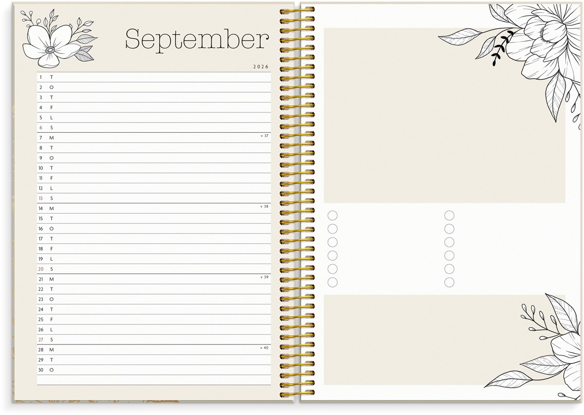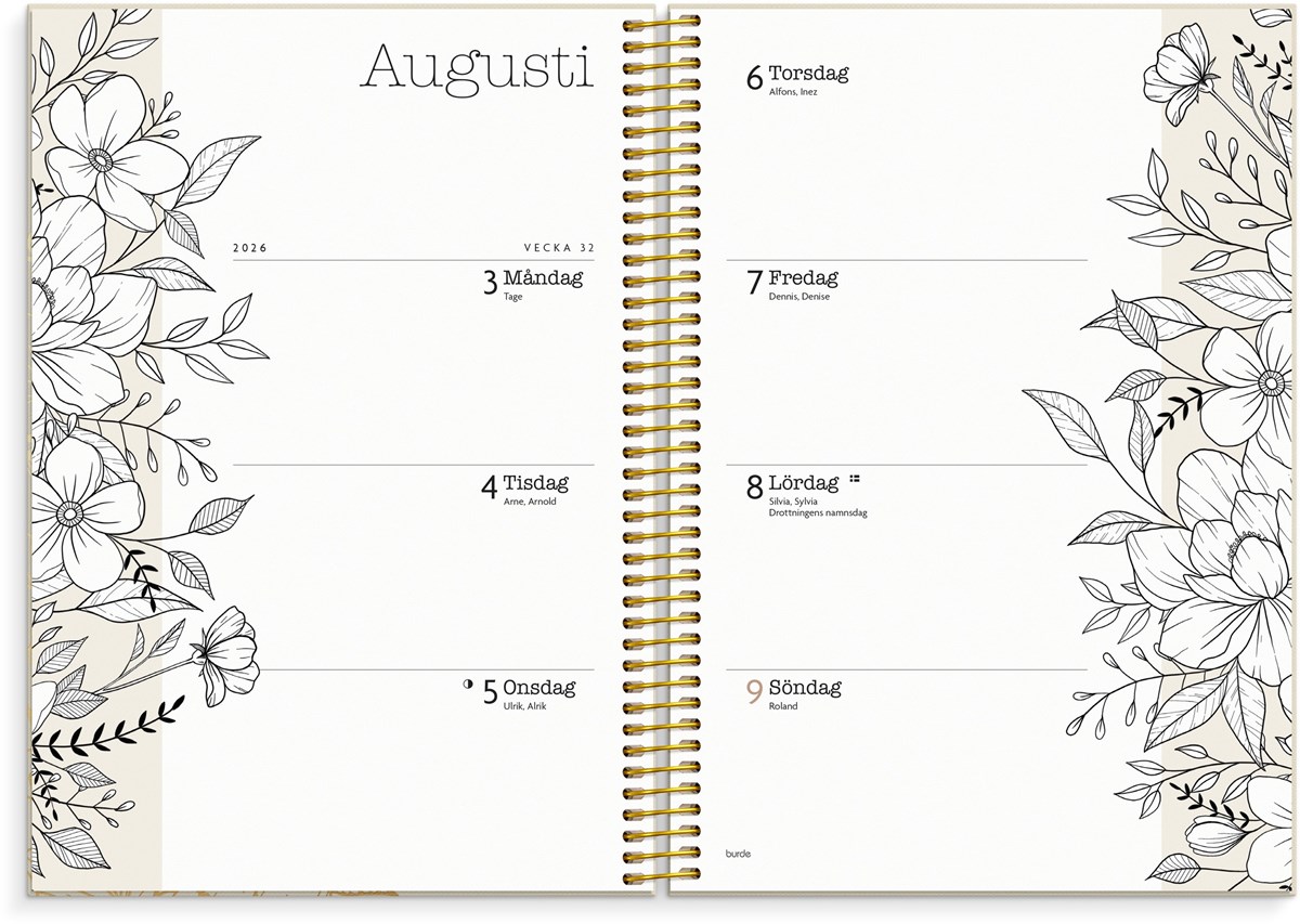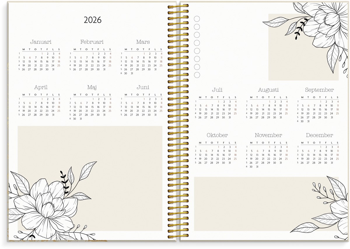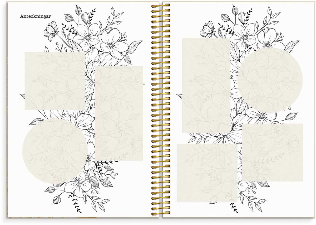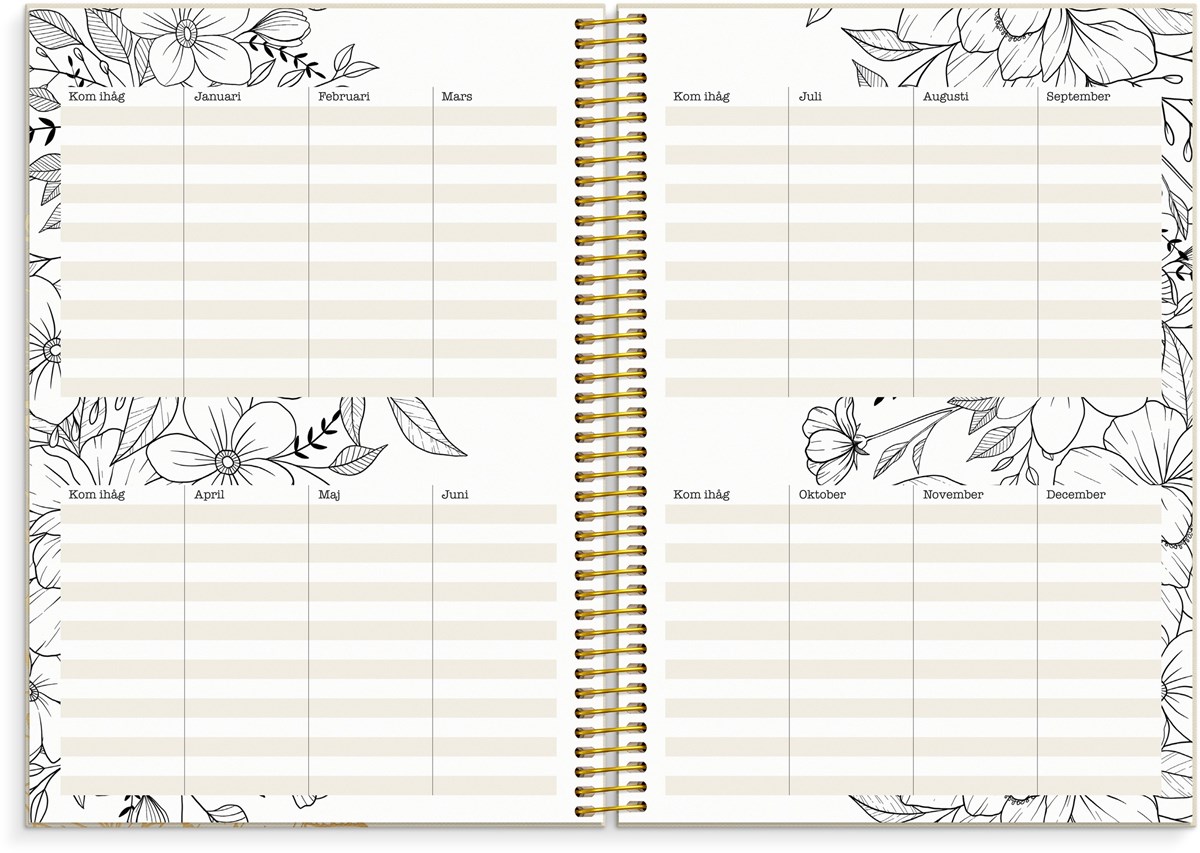En kalender med en smakfull och romantisk inlaga, med handritade blomsterillustrationer. Välj att behålla den dämpade färgskalan eller själv sätta färg på den. Life Planner Bloom har ett tjockare papper för att förhindra att pennor blöder igenom till nästa sida.