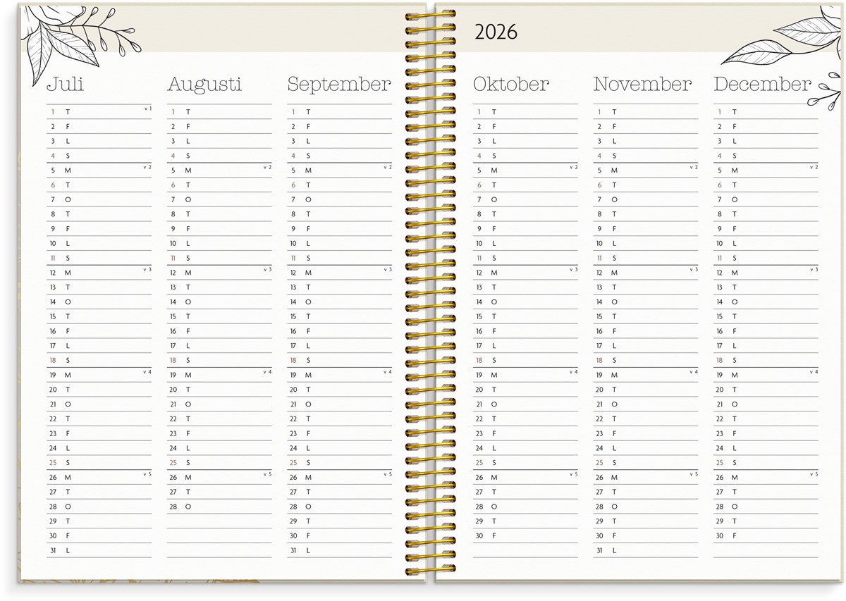 Format: A5. Layout: Liggande. Vecka/uppslag. Kalendarium: 2025-12-15 - 2027-01-03. Omslag: Kartong med struktur. Spiralbunden. Detaljer: Flyttbar plastlinjal. Pappersficka. Innehåll: Checklistor, Månads- och veckoplanering, Anteckningssidor, Årsplan/årsplaner, Årsöversikter innevarande och följande år. Antal sidor: 160. Miljöinformation: FSC®.