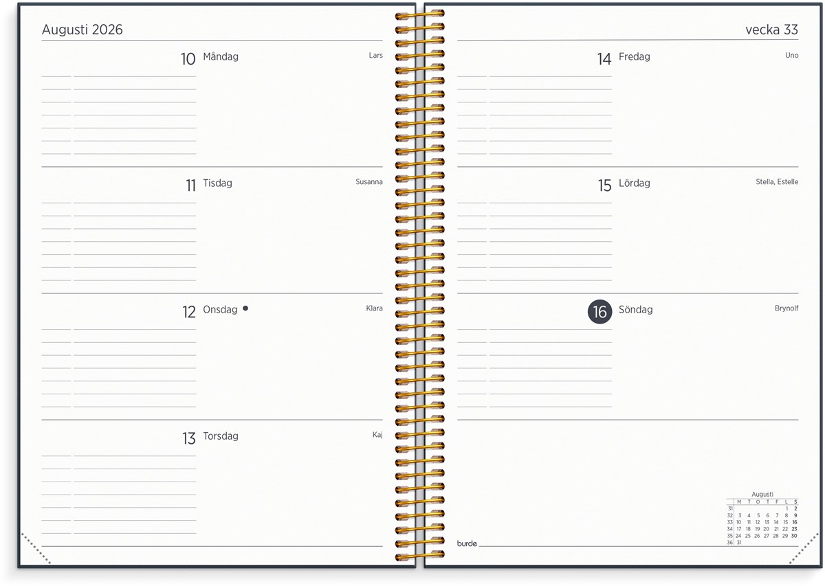 Format: A5. Layout: Liggande. Vecka/uppslag. Kalendarium: 2025-12-08 - 2027-01-03. Omslag: Kartong med struktur. Spiralbunden. Detaljer: Gummiband. Flyttbara plastmarkörer. Innehåll: Flaggdagar, Helgdagar/aftnar, Månfaser, Namnsdagar, Temadagar/händelser, Årsöversikt/årsöversikter, Årsplan/årsplaner. Antal sidor: 256. Miljöinformation: FSC®.