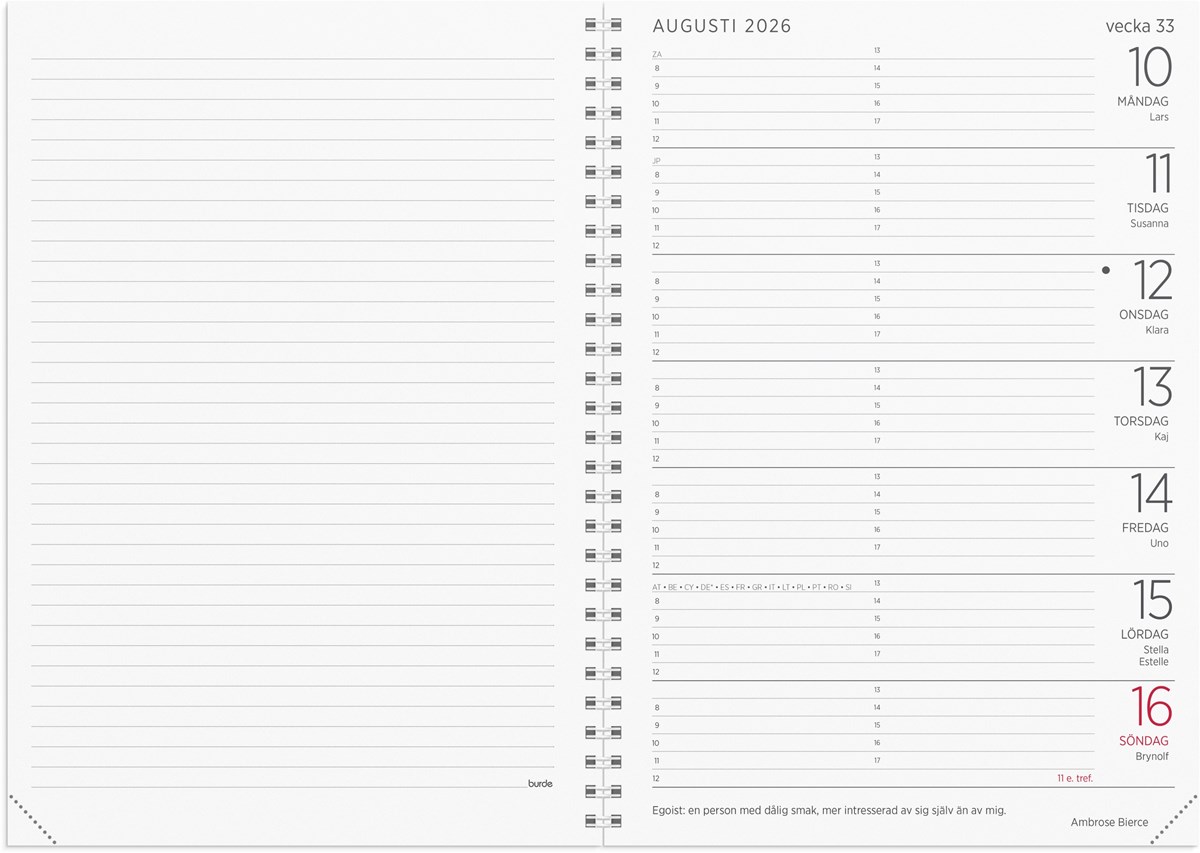 Format: A5. Layout: Liggande. Vecka/uppslag. Timindelning 8-17. Kalendarium: 2025-12-22 - 2027-01-03. Omslag: Kartong. Spiralbunden. Innehåll: Kyrkliga helgdagar, Flaggdagar, Helgdagar/aftnar, Internationella helgdagar, Linjerade vänstersidor, Månfaser, Namnsdagar, Internationella helgdagar översikt, Löst telefonblad, Temadagar/händelser, Årsöversikt/årsöversikter, Årsplan/årsplaner. Antal sidor: 112. Miljöinformation: FSC®.