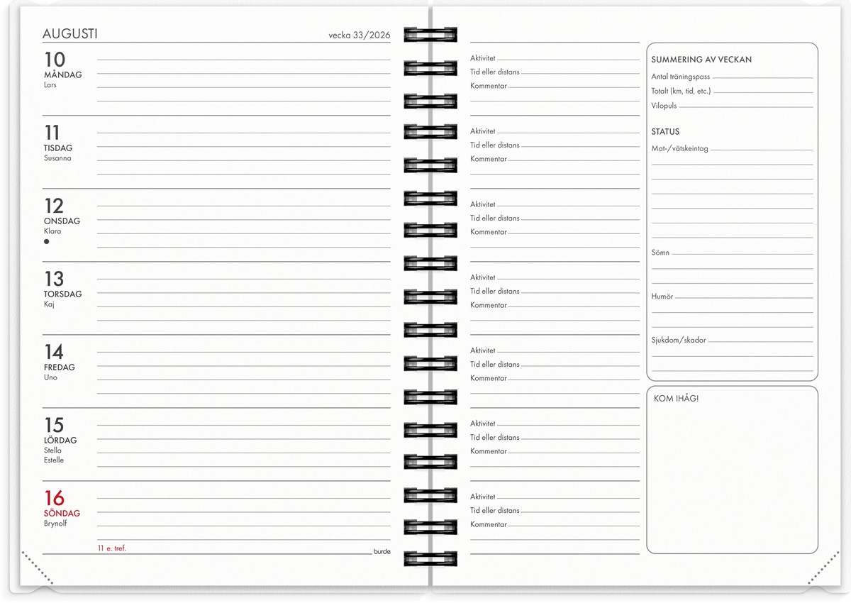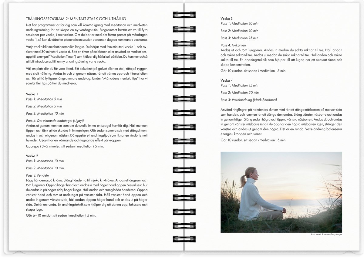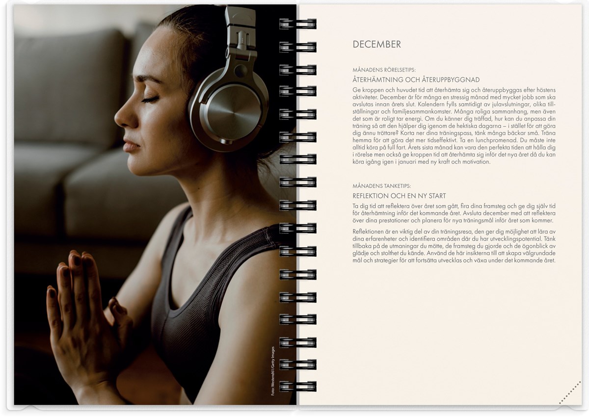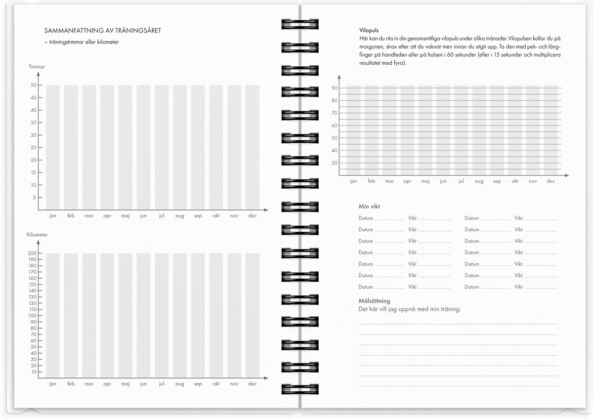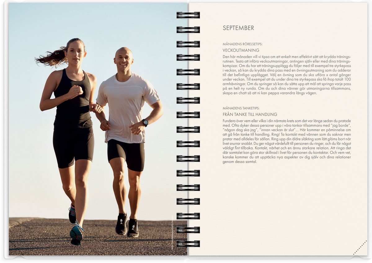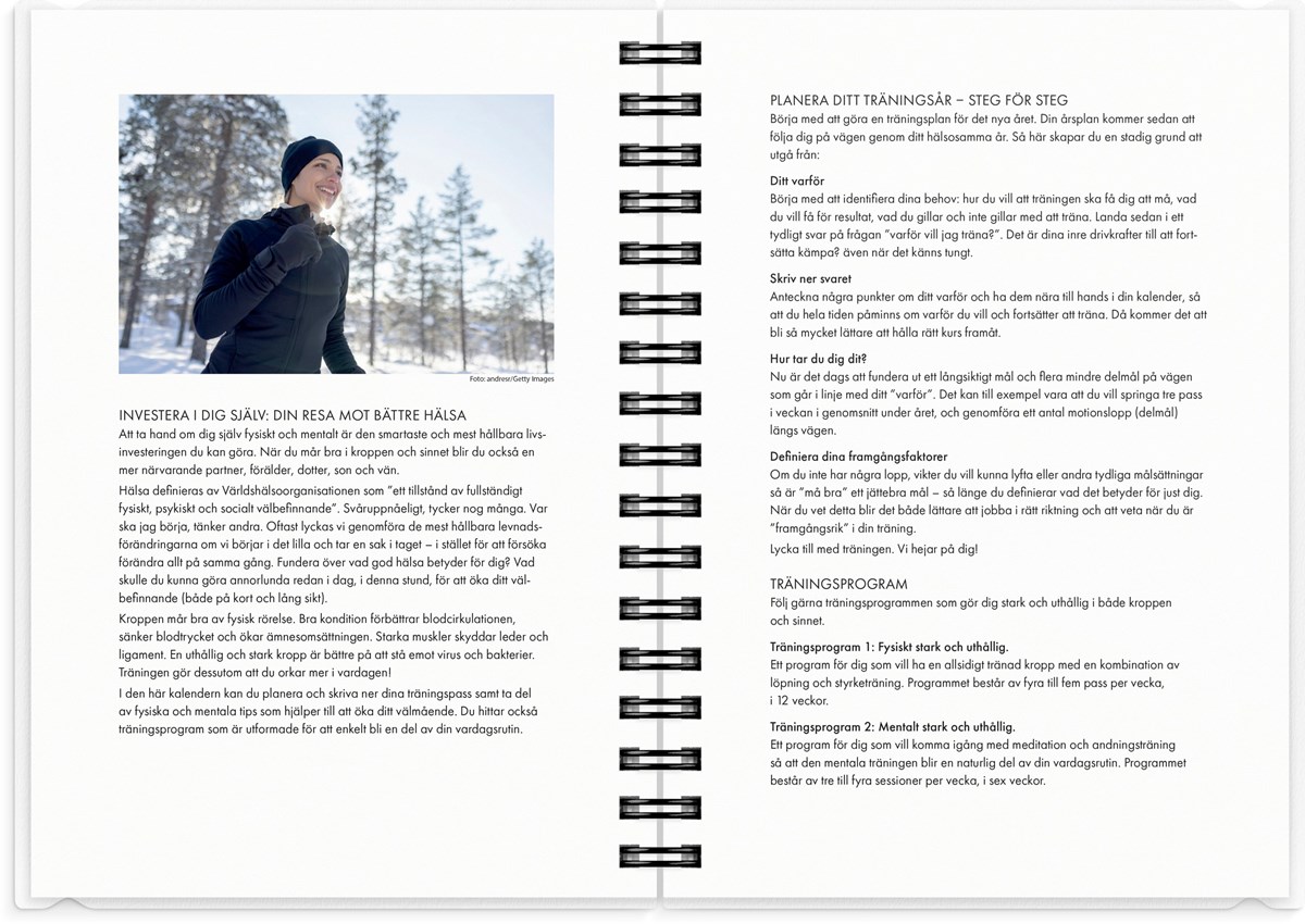 Träningskalendern hjälper dig att få sunda vanor i din vardag, men även att behålla dem över tid. Kalendern passar dig som vill ha en allsidig träning med en kombination av löpning och styrketräning. Det ingår även ett program för dig som vill komma i gång med meditation och andningsövningar så att den mentala träningen blir en naturlig del av din vardag också. Båda programmen är signerade löpcoachen och PT:n Jenny Sunding. Jenny ger också hälsosamma tips som håller inspirationen vid liv hela året. På varje uppslag finns dels en kalendersida med veckoplanering och dels en aktivitetssida. Träningskalendern har ett funktionellt plastomslag för att kunna följa med dig på träningspassen och även 2 framsidor att växla mellan.