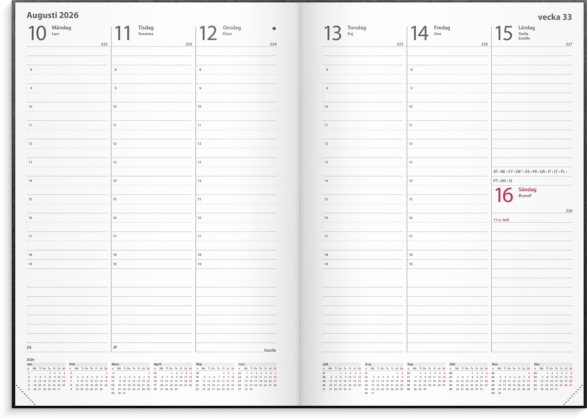 Format: A5. Layout: Stående. Vecka/uppslag. Timindelning 8-19. Kalendarium: 2025-12-08 - 2027-01-03. Omslag: Konstläder. Inbunden. Detaljer: Märkband. Innehåll: Kyrkliga helgdagar, Flaggdagar, Helgdagar/aftnar, Internationella helgdagar, Månfaser, Namnsdagar, Internationella helgdagar översikt, Temadagar/händelser, Årsöversikt/årsöversikter, Årsplan/årsplaner. Antal sidor: 144. Miljöinformation: FSC® papper.