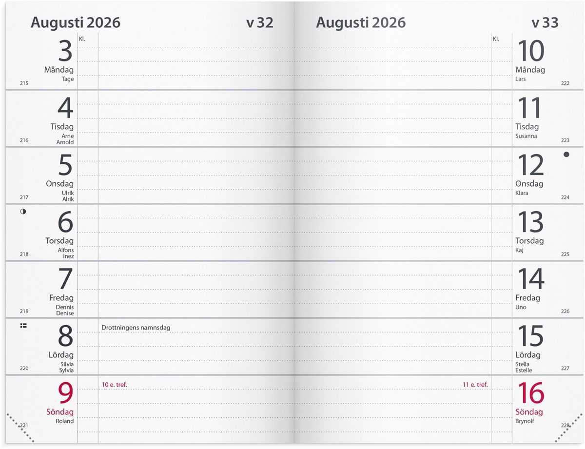 Format: 85x127 mm. Layout: Liggande. Två veckor/uppslag. Kalendarium: 2025-12-22 - 2027-01-03. Omslag: Kartong. Häftklamrad. Innehåll: Kyrkliga helgdagar, Flaggdagar, Helgdagar/aftnar, Månfaser, Namnsdagar, Internationella helgdagar översikt, Temadagar/händelser, Årsöversikt/årsöversikter, Årsplan/årsplaner. Antal sidor: 64. Miljöinformation: FSC®.