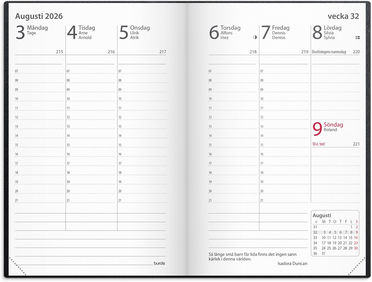 Format: 83x127 mm. Layout: Stående. Vecka/uppslag. Timindelning 7-21. Kalendarium: 2025-12-08 - 2027-01-03. Omslag: Skinn. Inbunden. Innehåll: Atlas, Kyrkliga helgdagar, Flaggdagar, Helgdagar/aftnar, Månfaser, Namnsdagar, Internationella helgdagar översikt, Telefonregister, Temadagar/händelser, Årsöversikt/årsöversikter, Årsplan/årsplaner. Antal sidor: 184. Miljöinformation: FSC®.