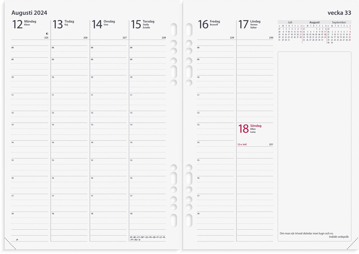Kalender 2024 från Burde. Format: A5. Layout: Stående. Vecka/Uppslag. Timindelning 8-18. Kalendarium: 2023-11-27 - 2025-01-05. Omslag: Kartong. Detaljer: Flyttbar linjal. Innehåll: Årsöversikter, årsplaner, blankettdel med att göra, att kontakta, kassabok, anteckningar rutade/linjerade, telefonregister. Linjal, register standard, register A-Ö. FSC. Antal sidor: 192. Miljöinformation: FSC.