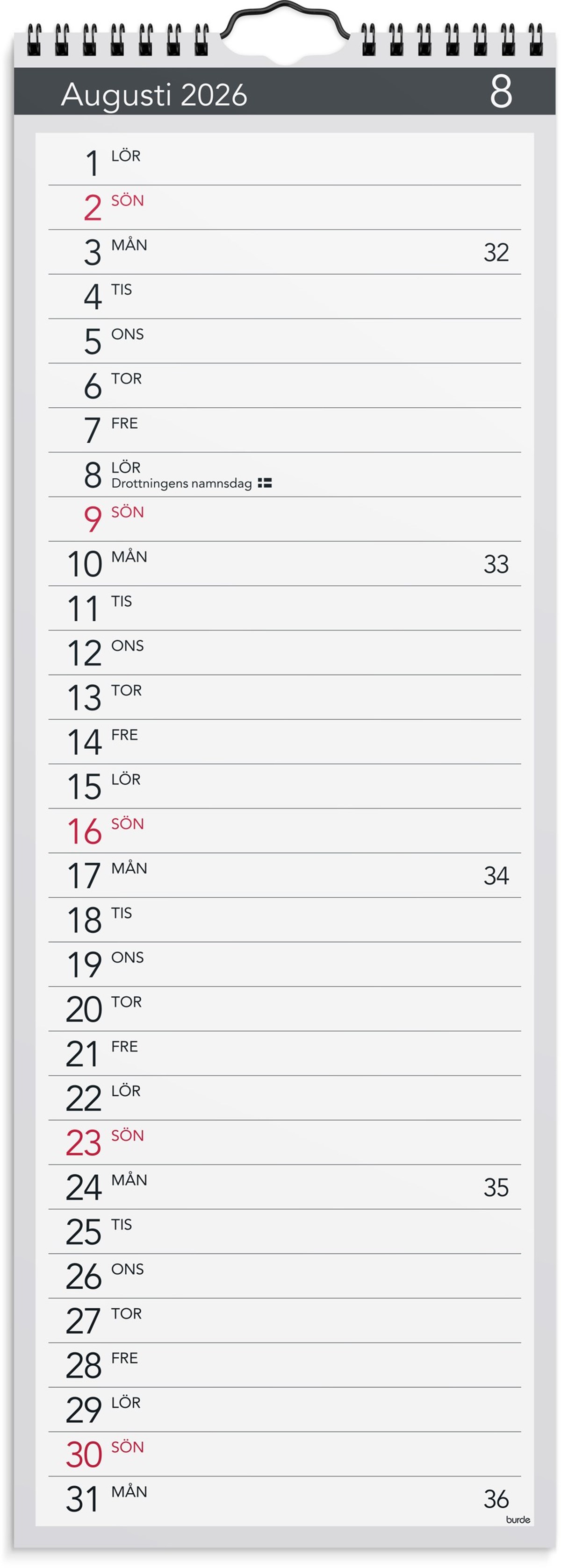 Format: 175x490 mm. Layout: Månad/blad. Kalendarium: 2026-01-01 - 2026-12-31. Spiralbunden. Innehåll: Flaggdagar, Helgdagar. Antal sidor: 12. Miljöinformation: FSC®.