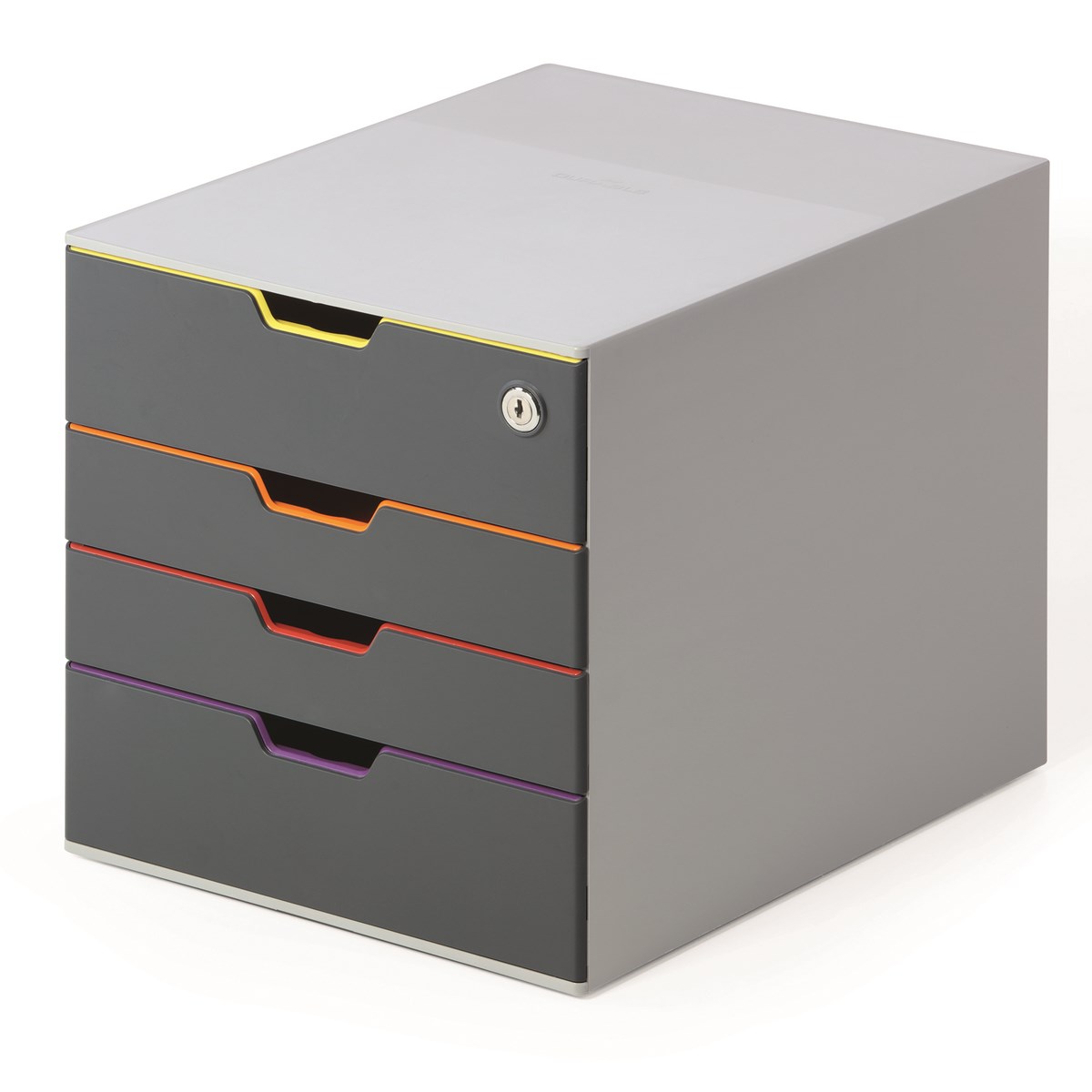 Blankettbox med fyra färgglada lådor som förenklar organiseringen av dokument. Översta lådan är låsbar. Lättglidande lådor med utdragsstopp. För format upp till A4 och C4-format. Transparenta etiketter för märkning av innehåll medföljer. Stapelbar med antiglidfötter på undersidan. Mått: 292 x 280 x 356 mm.