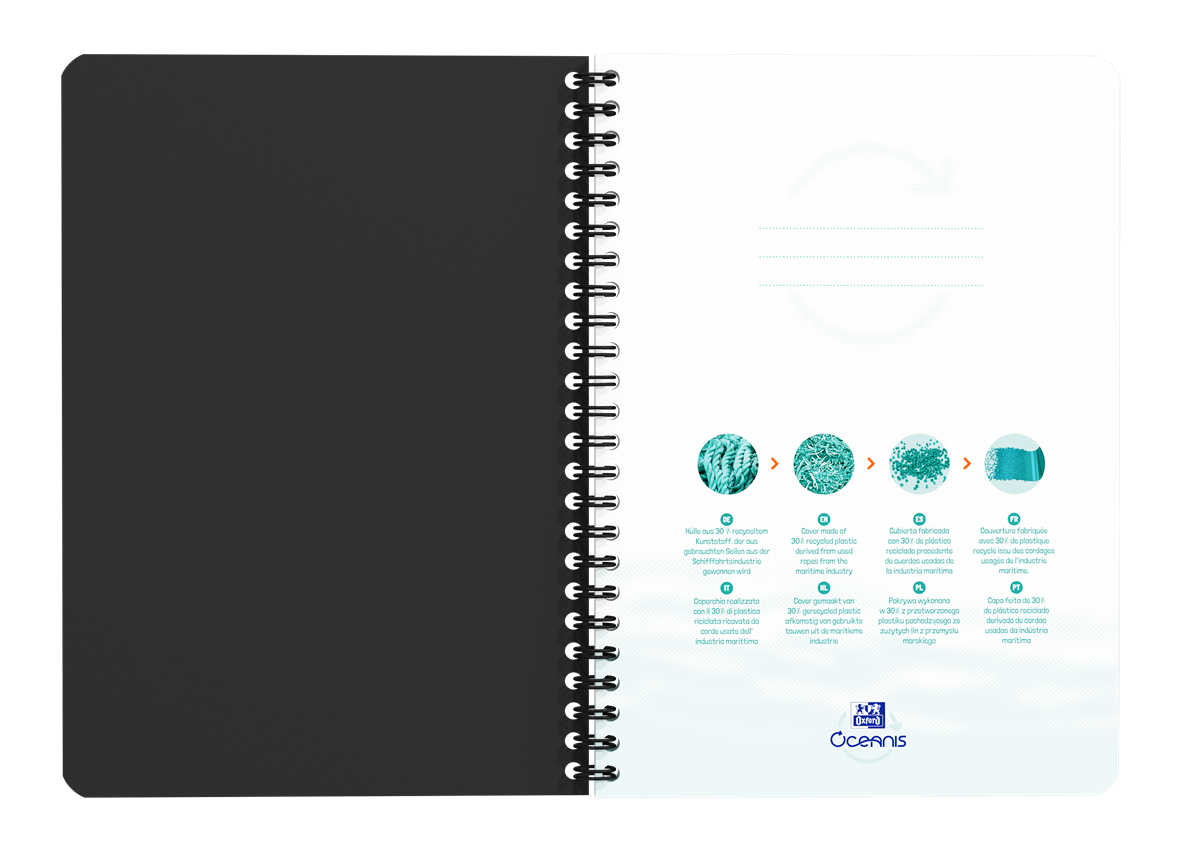 Omslag i slitstark polypropylen som till 30% är tillverkad av återvunna rep och fiskenät från havets botten, twin-wire-spiral som inte fastnar i väskan. 90 blad linjerat vitt Optik paper+ som motverkar motljus och är behagligt att skriva på. Bläcket blöder inte igenom pappret vilket gör att båda sidor kan nyttjas. Kompatibel med Scribzee. Skanna dina noteringar och kom åt dom när som helst via molnet. Blandade färger. 5 st/förp.