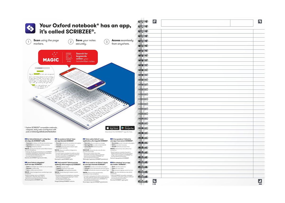 Omslag i slitstark polypropylen som till 30% är tillverkad av återvunna rep och fiskenät från havets botten, twin-wire-spiral som inte fastnar i väskan. 90 blad linjerat vitt Optik paper+ som motverkar motljus och är behagligt att skriva på. Bläcket blöder inte igenom pappret vilket gör att båda sidor kan nyttjas. Kompatibel med Scribzee. Skanna dina noteringar och kom åt dom när som helst via molnet. Blandade färger. 5 st/förp.