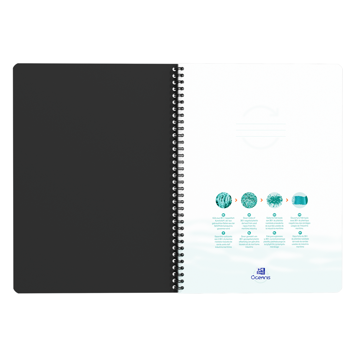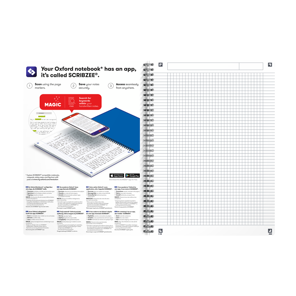 Vatten- och smutsavvisande omslag Omslag tillverkat av återvunnen plast Bläcket blödet inte igenom pappret Dubbelspiral, fastnar inte i väskan Scribzee, skanna dina anteckningar