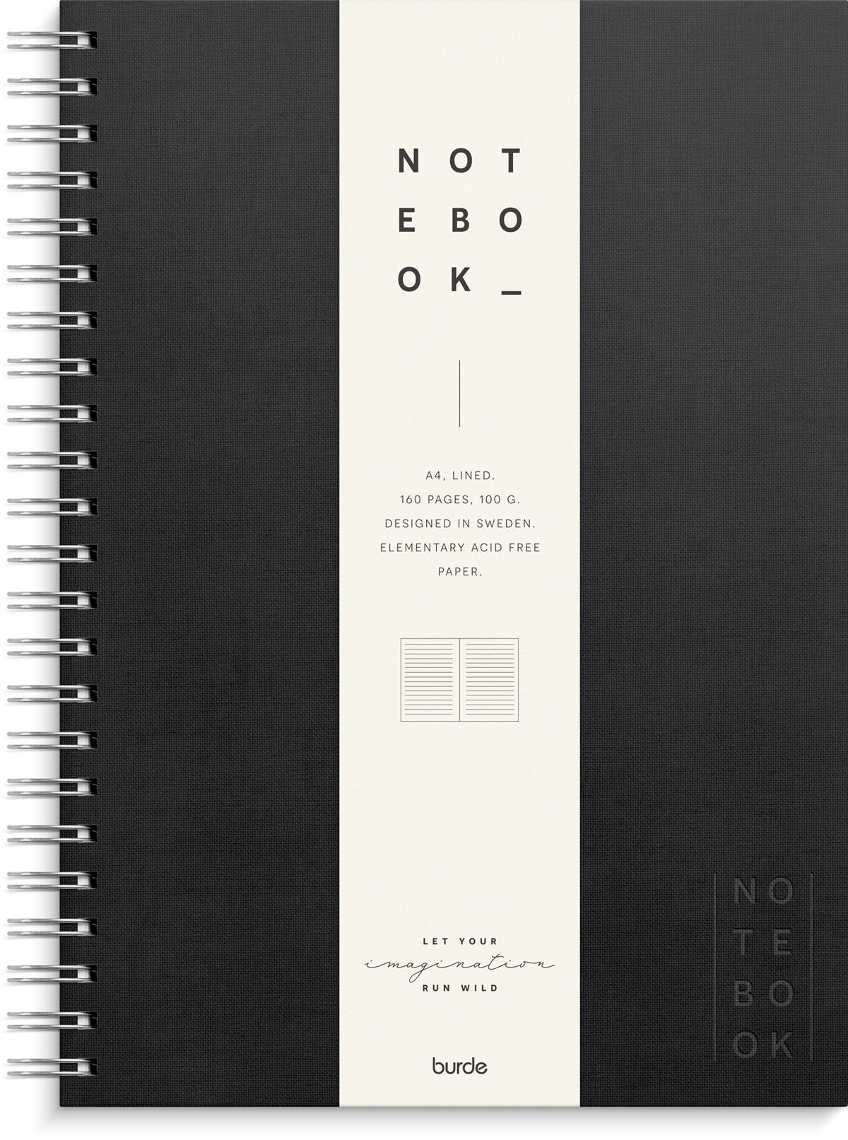 Format: A4. Layout: Linjerad. Omslag: Linnetextil. Spiralbunden. Antal sidor: 160. Pappersvikt: 100 g. Miljöinformation: FSC® papper. Varumärke: Burde.