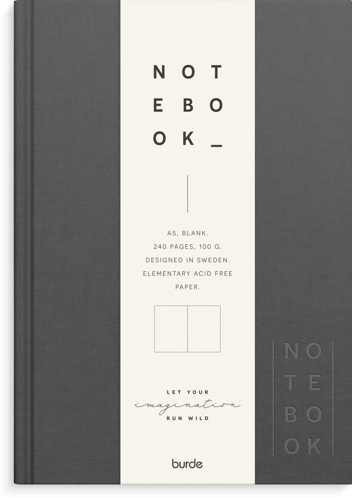 Format: A5. Layout: Olinjerad. Omslag: Linnetextil. Inbunden. Detaljer: Märkband. Antal sidor: 240. Pappersvikt: 100 g. Miljöinformation: FSC® papper. Varumärke: Burde.