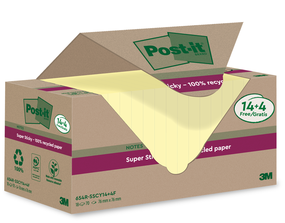 Post-it® Recycled Super Sticky Notes är tillverkade av 100 % återvunnet papper och är återvinningsbara. Dessa självhäftande notes är perfekta för att göra anteckningar eller lämna meddelanden och påminnelser på. De är perfekta för vertikala och ojämna ytor så att du kan fästa dem där du behöver dem. Super Sticky Notes har dubbelt så stark häftförmåga som Post-it® Original Notes, så du kan vara säker på att ditt meddelande sitter kvar. Tillverkas av PEFC-certifierade pappersfibrer, som kommer från hållbart skogsbruk och kontrollerade resurser. De har ett häftämne som tillverkas av en förnybar resurs, som till 60 % kommer från en växt som växer upp igen varje år. Förpackningen tillverkad av återvunnen wellpapp kan användas för att enkelt förvara dina notes i ett skrivbord eller skåp och kan återvinnas när de inte behövs längre.