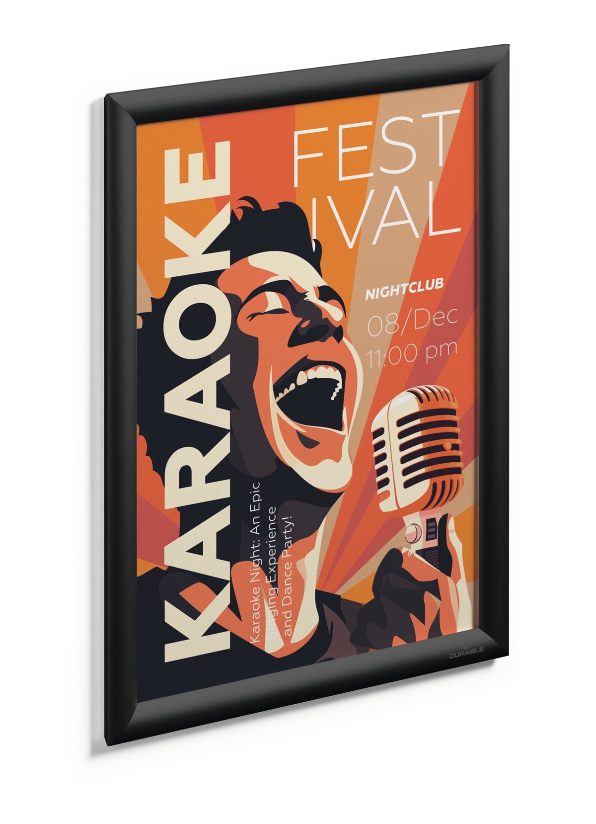 Klassiska snäppramar är användbara t.ex. på gym, kontor, hotell, mässor och i butiker för att på ett snyggt sätt visa information som behöver bytas ut ibland. Byt inlaga genom att fälla upp alla 4 sidoprofiler och tag bort den UV-tåliga och antireflekterande plastfronten som skyddar inlagan. Ramen är gjord av en 25 mm bred anodiserad aluminiumprofil, vilket gör aluminumytan mer hållbar. Klickramens baksidan är av tålig polystyren. Dolda hål för medföljande skruv och plugg samt 4 medföljande självhäftande remsor, för valfri väggmontering i stående eller liggande format.