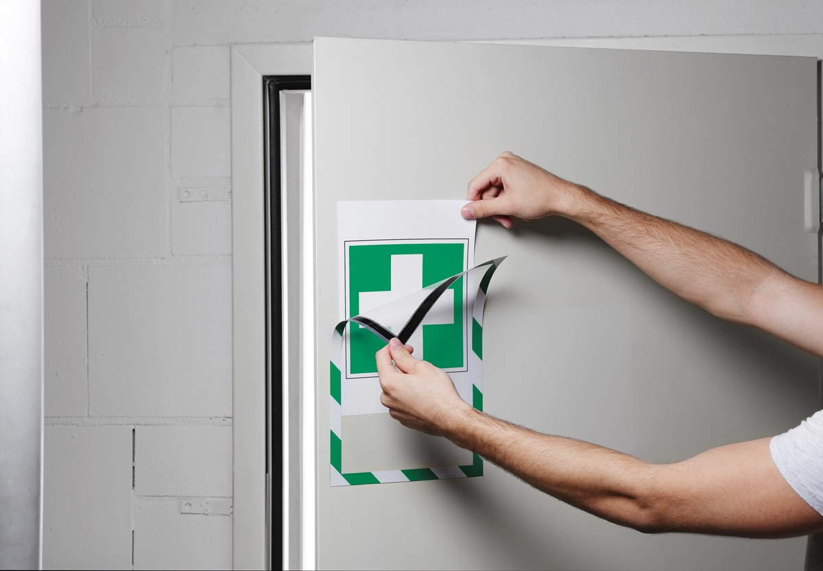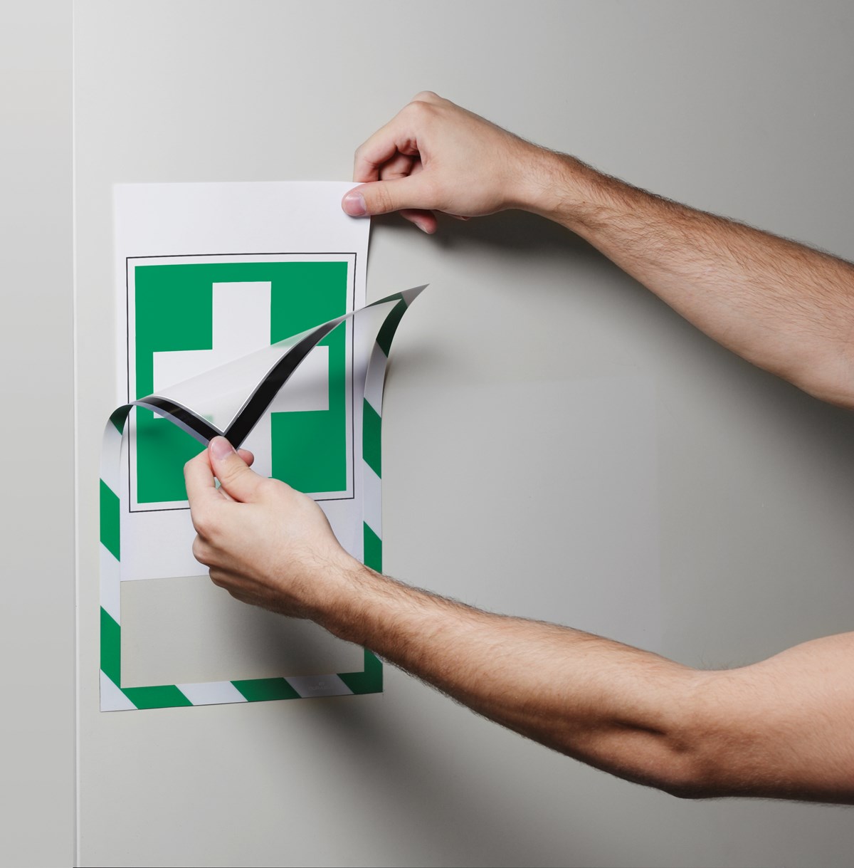 Magnetisk baksida. Med varselfärger för säkerhets- och varningsinformation i produktionsområden och på kontor. Säkerhetsfärger enligt ISO 3864-4. A4-format. För stående och liggande format. 5 st/förp.