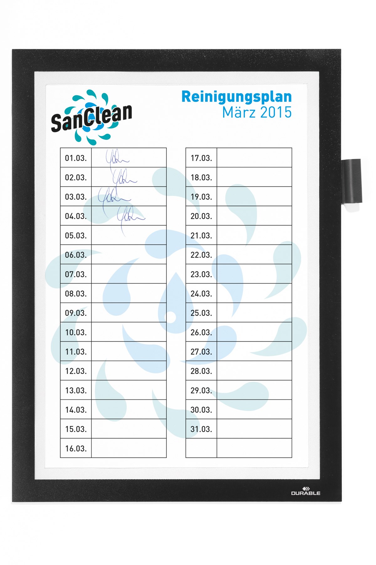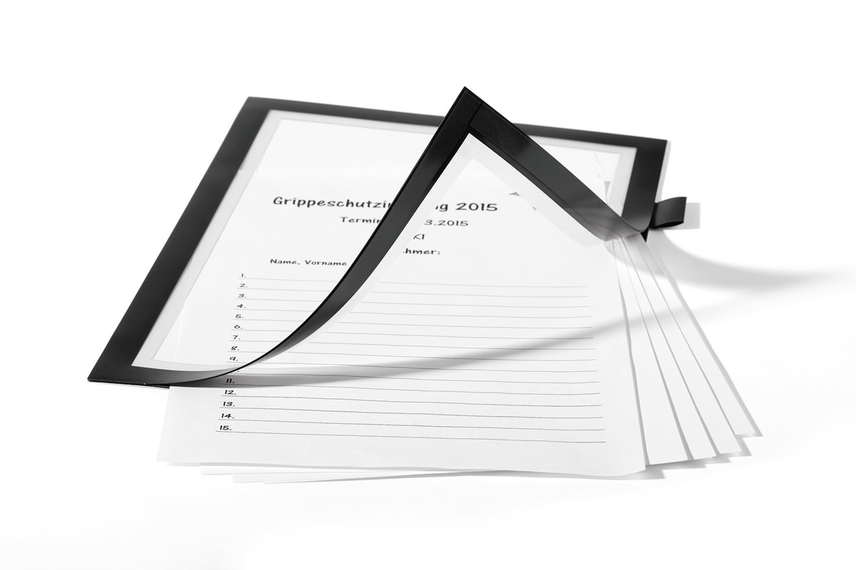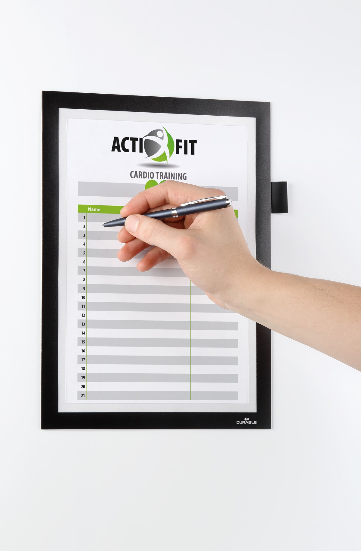 Öppen framsida vilket gör det möjligt att skriva direkt på pappret utan att behöva ta ut det först. Perfekt för t.ex. städscheman, registrerings- och checklistor. Fäster på släta ytor och kan tas bort från glasytor. Med hållare för pennor med clips. Plats för upp till 5 st A4-ark. för stående och liggande format.