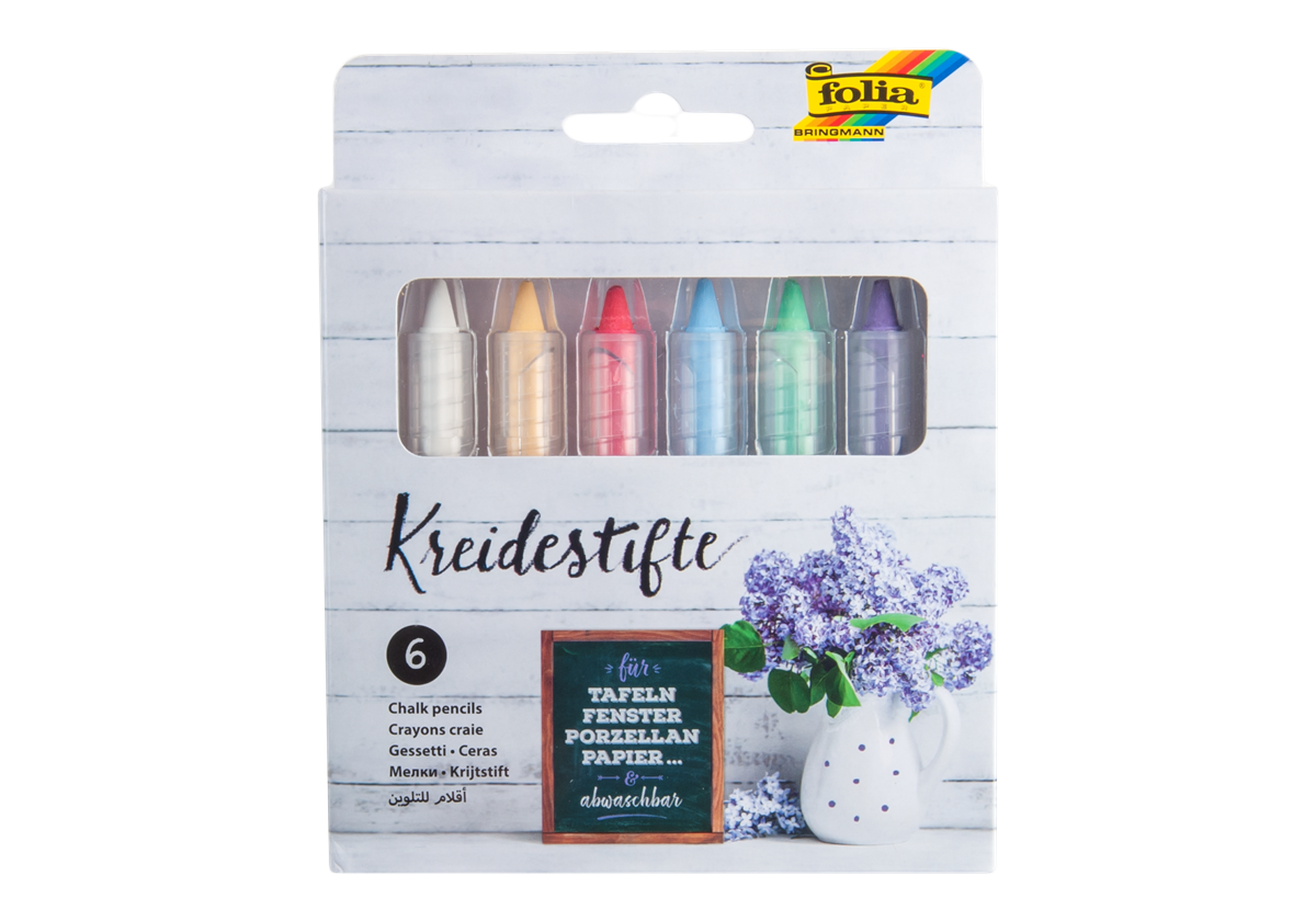 Griffelkrita i sex olika färger. Pennorna är vattenlösliga, samt har vridmekanism för att mata fram stiftet efterhand som pennan används. Passar bra att skriva på griffelskivor, griffelplast, fönster och glas.