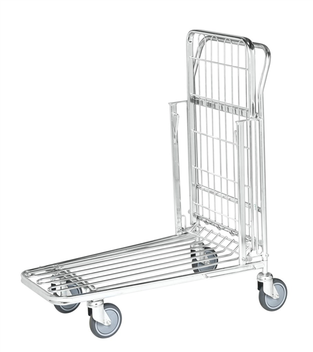 Stackningsbar butik/lagervagn, övre hyllplanet uppfällbart. Belastning övre hyllplan 100 kg.
