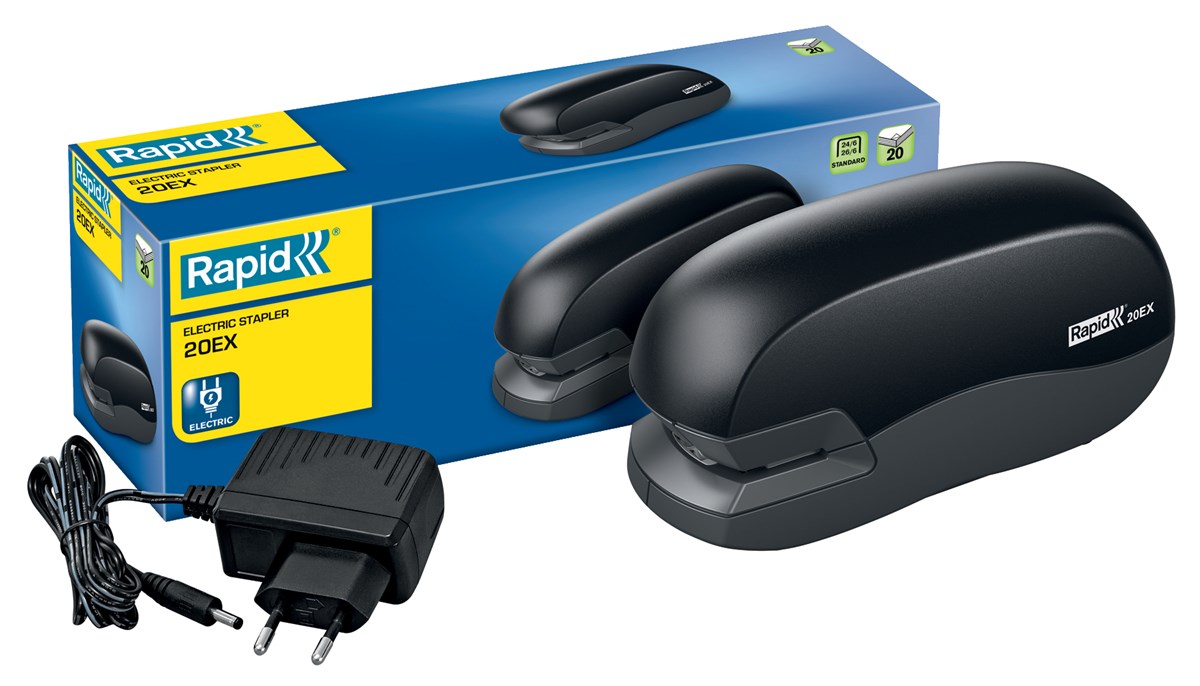 Kompakt elektrisk häftapparat för skrivbord, reception eller hemanvändning. Strömförsörjning via nätadapter (medföljer), med enkel enhandshäftning. Öppnas från framsidan för enkel laddning. För 24/6 och 26/6 Rapid Standard häftklammer.