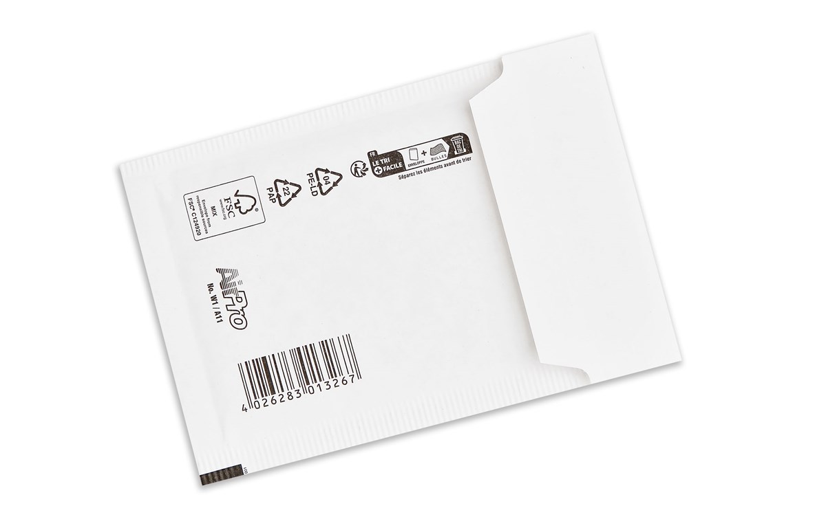 Vit, stötdämpande bubbelfoliepåse för ömtåliga ting. Självhäftande klaff, Peel & Seal samt två förstansade hål för klämmor eller nitar.