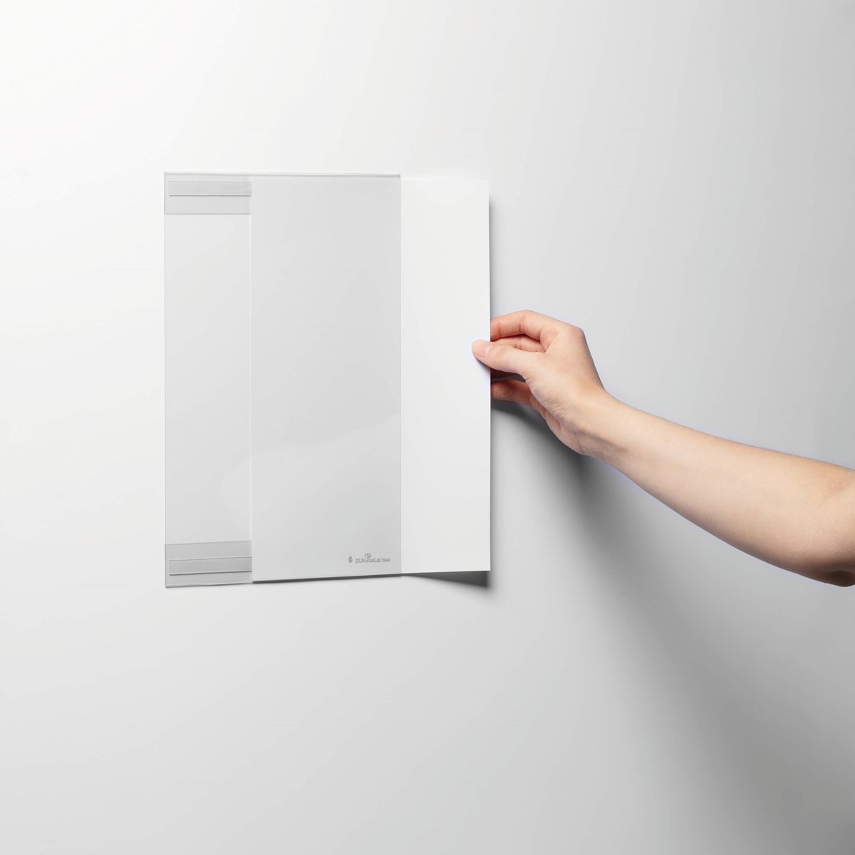 Självhäftande ficka av 80% återvunnen rPET plast. Visar och skyddar inlagan med information på t ex mässor, gym, kontor, i butiker, klassrum och väntrum. Glasklar front utan tryck, med vikt över- och underkant, som bildar en profil, som pappret skjuts in i från sidan. De två självhäftande tejpremsorna fäster permanent på rena och fasta ytor, även lite ojämna underlag. För dokument i stående format.
