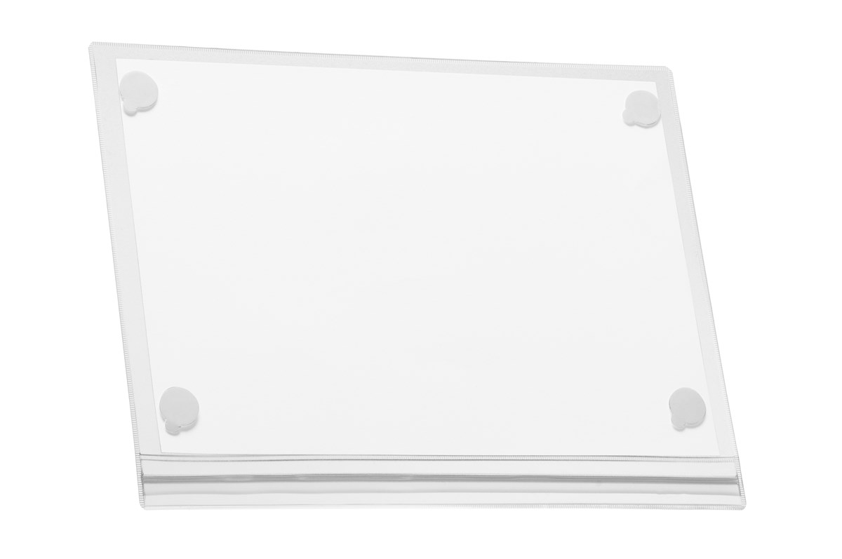 Vattentåliga plastfickor för användning utomhus – enkla att byta inlagan i Väderbeständiga och vattentäta plastfickor avsedda för information som ska visas utomhus där det finns risk för skvättande vatten t.ex. vid handelsträdgårdar, poolområden, grindar och anslagstavlor. Tål sol, hög fuktighet, dagg, regn och skvättande vatten. Plastfickorna är gjorda av transparent, UV-stabil och väderbeständig plast med antireflekterande effekt. Vattentät tryckförsegling skyddar mot väta. Testade enligt IPX5 standard. Tillverkade av återvunnen Blue Angel-certifierad plast. Kan användas i stående eller liggande format. 2 ark, som fickan rymmer, ingår. Självhäftande, fästes med de medföljande fästkuddarna som kan tas bort utan att lämna rester. 5 st/förp.