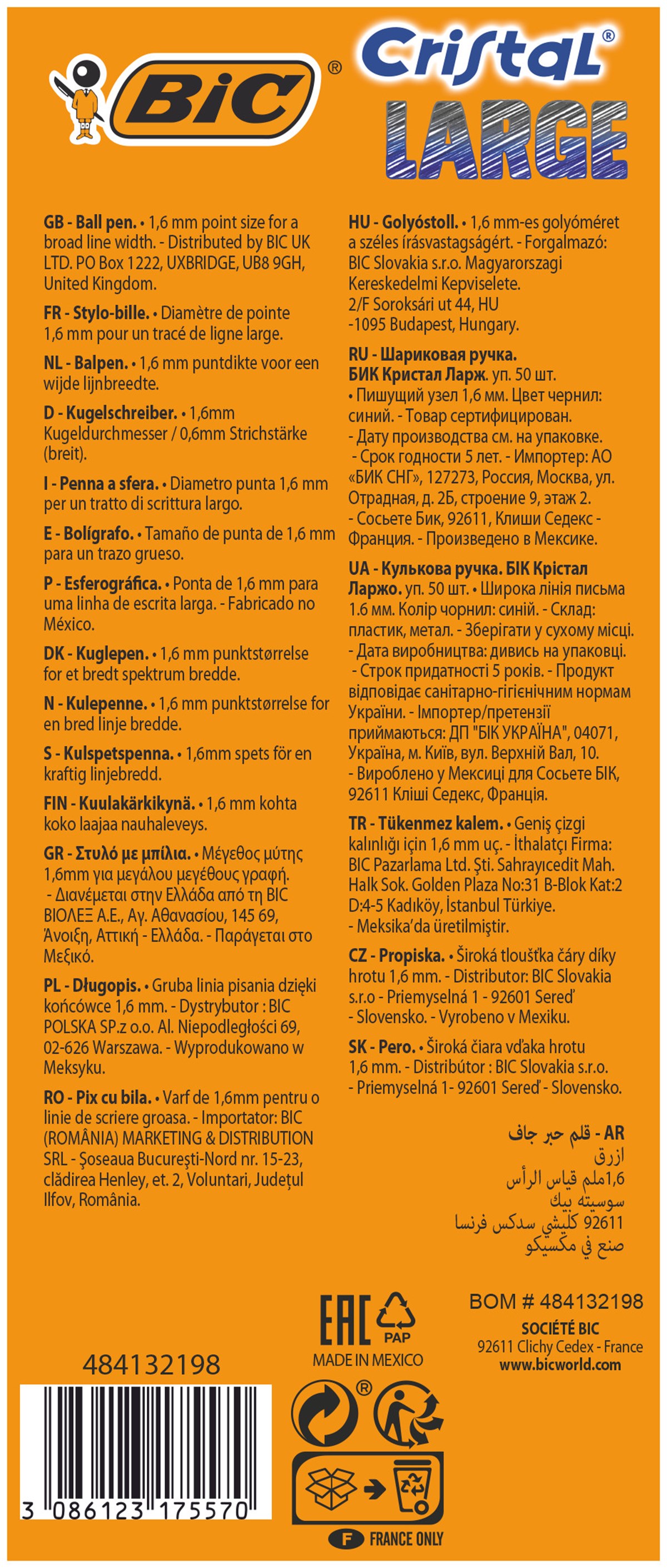 Genom årens lopp har den första BIC-pennans karakteristiska design gjort den till en klassiker. BIC Cristal-pennan och dess stora familj – Fine, Fun, Grip, Original, Soft och Large – täcker allas skrivbehov. BIC Cristal Large-pennan har en 1,6 mm bred spets för linjer som är ännu jämnare och mörkare. Den här slitstarka kulspetspennan är perfekt för långa skrivuppgifter och snabba anteckningar. Den fungerar lika bra för att rita samt lösa korsord och sudoku – både svåra och lätta. En vägledande princip hos BIC har alltid varit att hitta den perfekta balansen mellan funktion och design, så den BIC Cristal Large-pennan har en röktonad, sexkantig pennkropp så att du kan kontrollera bläcknivån. Klassiska BIC Cristal-pennan kommer även med en 1,6 mm bred spets för extra läsbarhet. Den välutformade kulan ger ett jämnt bläckflöde så skrivandet blir ett rent nöje. Korken och ändpluggen matchar färgen på bläcket så du snabbt hittar rätt färg.