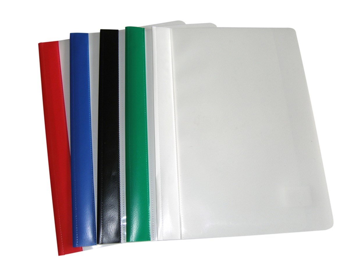 I A4-format. 0,3 mm PP med fästanordning och täckskena. Glasklar 0,15 mm tjock framsida, rygg i färg. 20 st/förp.