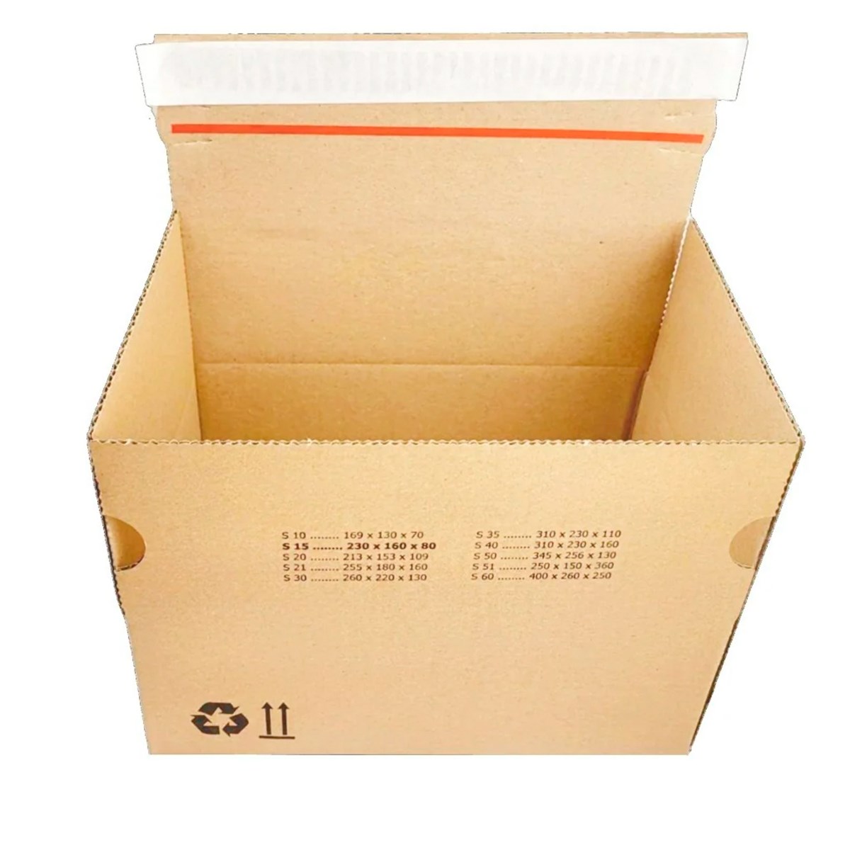 Smidig låda med Peal and Seal-stängning. Den självhäftande remsan gör att kartongen kan stängas utan att använda tejp. Utrustad med en rivtejp som gör att den enkelt kan öppnas. Lådan går snabbt att montera och packa eftersom den har en automatisk stängning i botten. FEFCO 703.
