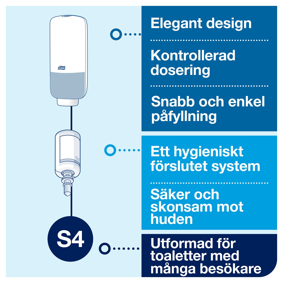Den beröringsfria doseringen är enkel att förstå för personer i alla åldrar och den förbättrar hygienen genom att minska risken för korskontaminering. Den moderna Elevation-designen kommer dessutom att imponera på gästerna. Dispensern fungerar med en rad förslutna hudvårdsprodukter, som skumtvål och flytande tvål, samt med handdesinfektion i skum-, gel- och flytande form, för ökad flexibilitet. LED-påfyllningsindikatorn ökar effektiviteten och förenklar planeringen för personalen. Mått: 11,2x27,8x12,8 cm. Passar med Tork S4 refiller.