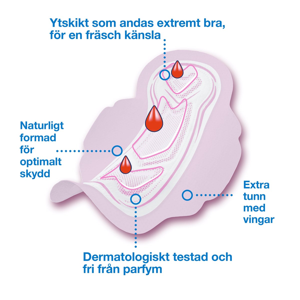 Extra tunna bindor med vingar som är utrustade med SecureFit och TripleProtection mot läckage Ytskiktet som andas extremt bra säkerställer en fräsch känsla Dermatologiskt testade och parfymfria för att passa alla hudtyper