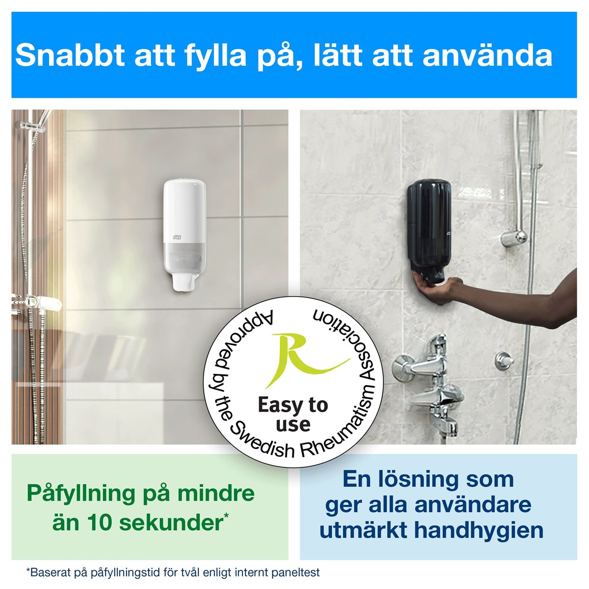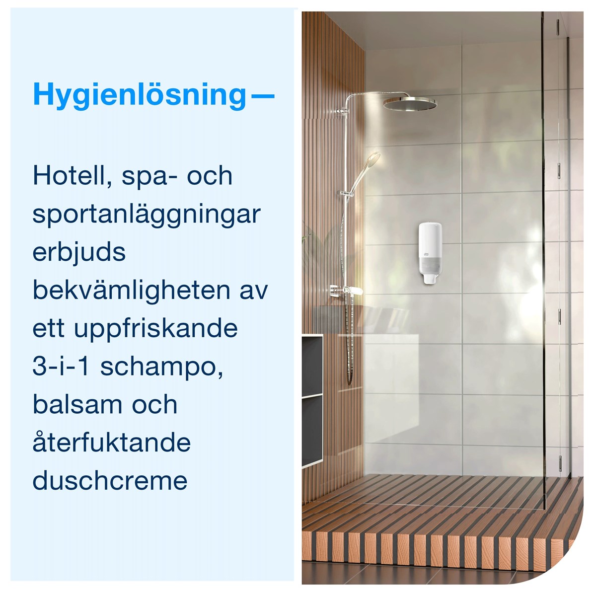 Tork Exklusiv 3-i-1 Hair & Body Duschcreme ger en lyxig 3-i-1 duschupplevelse som passar perfekt för hotell, spa och sportanläggningar. Formulan innehåller arganolja och balsam som ger tredubbla fördelar i form av uppfriskande schampo och balsam, samt återfuktande duschcreme. Förutom skonsam rengöring av hår och kropp håller den även håret mjukt och flexibelt. Duschcremen är certifierat enkel att fylla på av Svenska Reumatikerförbundet (testad i enlighet med The Design for All-test, publicerad i Swedish Design Research Journal 2011) och påfyllningen tar mindre än 10 sekunder (baserat på internt paneltest). Den förseglade flaskan levereras med en ny pump för varje refill för att minska risken för kontamination. Använd med Tork Dispenser för tvål och handdesinfektion, som är bevisat Easy to use och ger alla användare god handhygien.