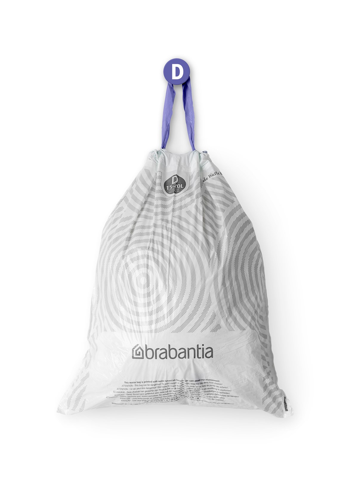 Brabantia PerfectFit avfallspåsar passar perfekt till såväl din Brabantia avfallshink som ditt hektiska liv. Det är därför är de extra starka och har det praktiska knytbandet! Dra bara i det för att ta påsen ur avfallshinken och försegla den. Är du inte säker på vilken storlek du behöver? Kontrollera helt enkelt färgkoden på insidan av avfallshinkens lock. Fantastiska avfallspåsar som passar perfekt till din Brabantia avfallshink.