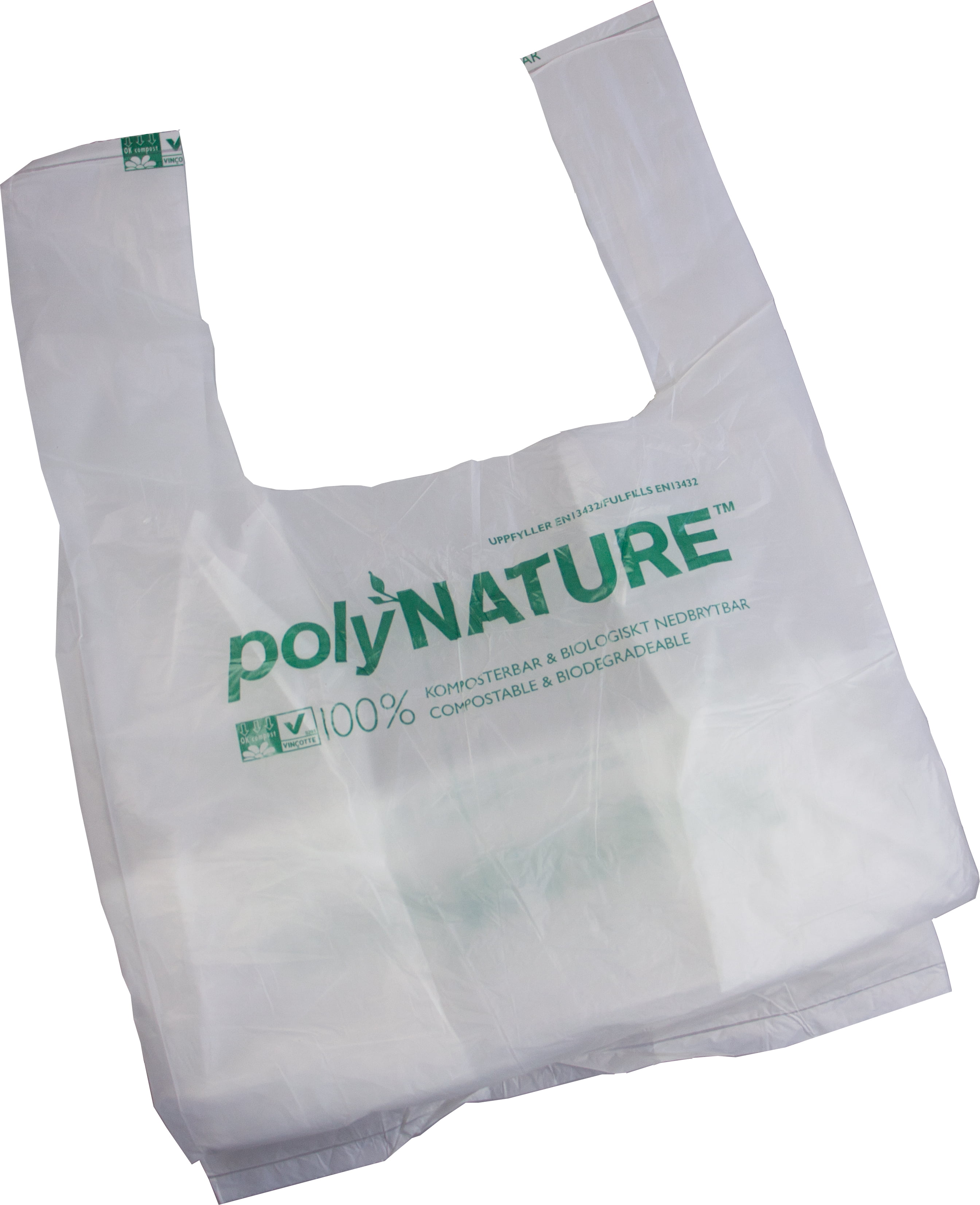 Vita påsar och säckar tillverkade av 100% biologiskt nedbrytbart material. Tillåter kompostering utan någon åverkan på djur- eller växtriket. Certifierade enligt EN13432.