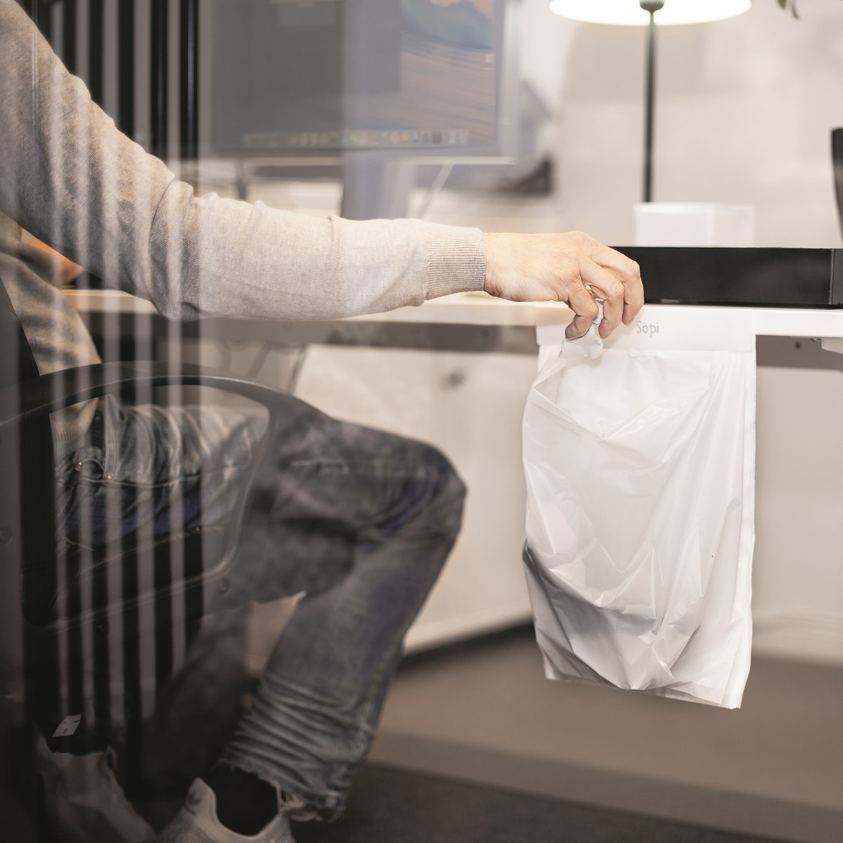 Sopi är en smidig sopkorgslösning med blockade påsar som fästs på en metallhållare. När påsen är full, dras den av med ett enkelt ryck. Sopi passar perfekt på tåg, i bussar, bilar och kontorsmiljöer. Välj mellan vår klassiker med pappryttare eller med uppdaterad design med ryttare av plast - lätt hantering och enklare återvinning. Mått: 215/150 x 350 mm. Tjocklek: 0,020 mm.