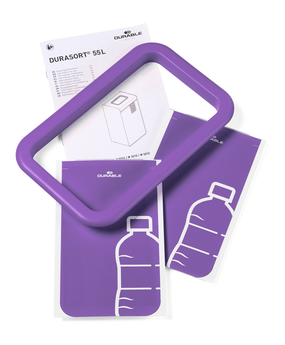 Durasort® 55L "plastförpackningar" är ett sopsorteringskärl som underlättar avfallssorteringen tack vare en lila ram runt inkastets öppning. Två lila klistermärken med en tydlig symbol för plastavfall medföljer. Kan exempelvis klistras på dörren för snabb identifiering i vilket källsorteringskärl plastförpackningar ska slängas.