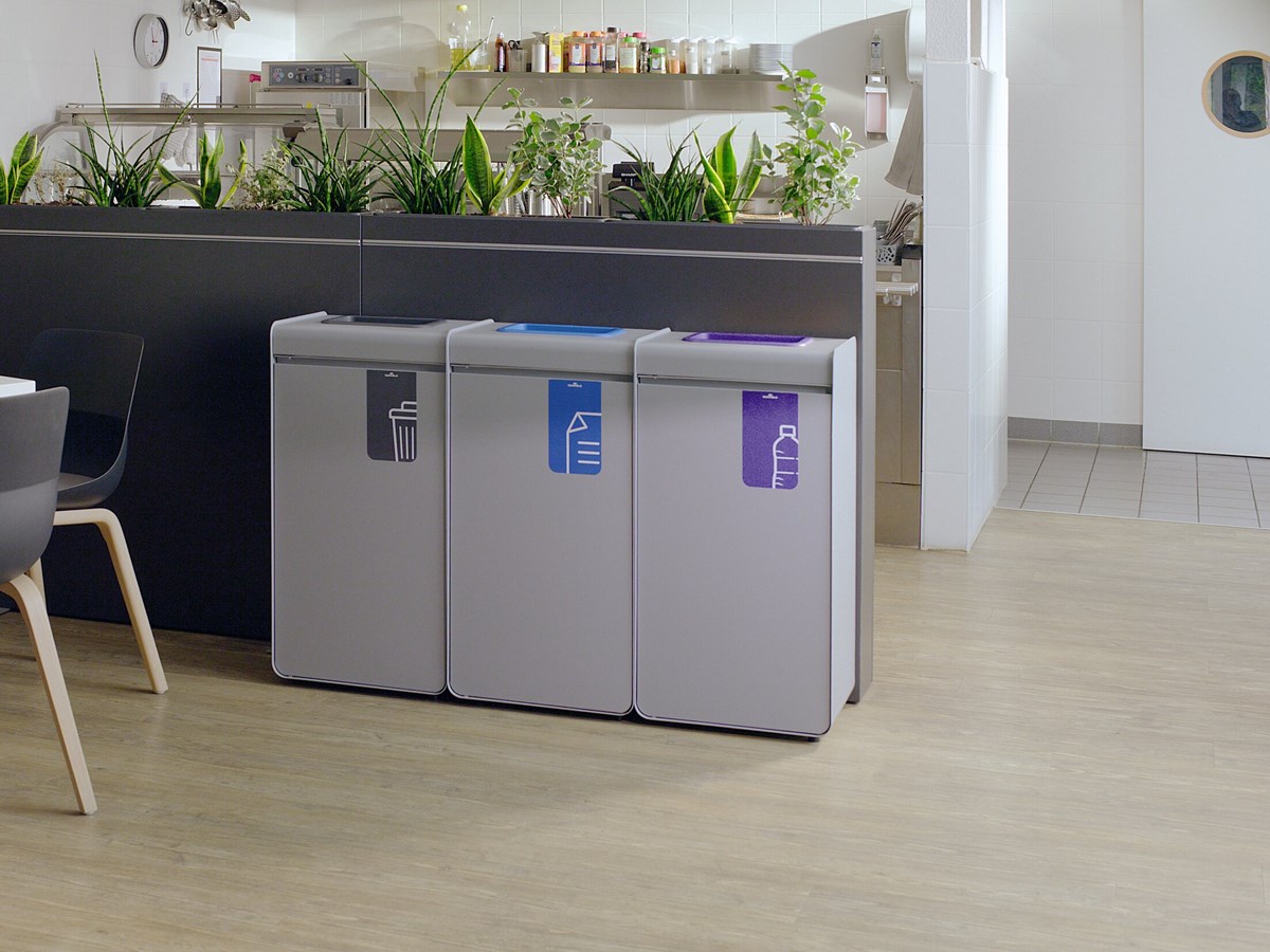 Tillverkad av pulverlackad metall, med en lättöppnad dörr med "tryck-och-öppna mekanism". Innerbehållaren av lätt plast rymmer 55 liter och har grepp så att den är lätt att ta ut och tömma. Möjlighet att fixera påsen om en sådan används. Justerbara fötter säkerställer att kärlet står stabilt på ojämna ytor.